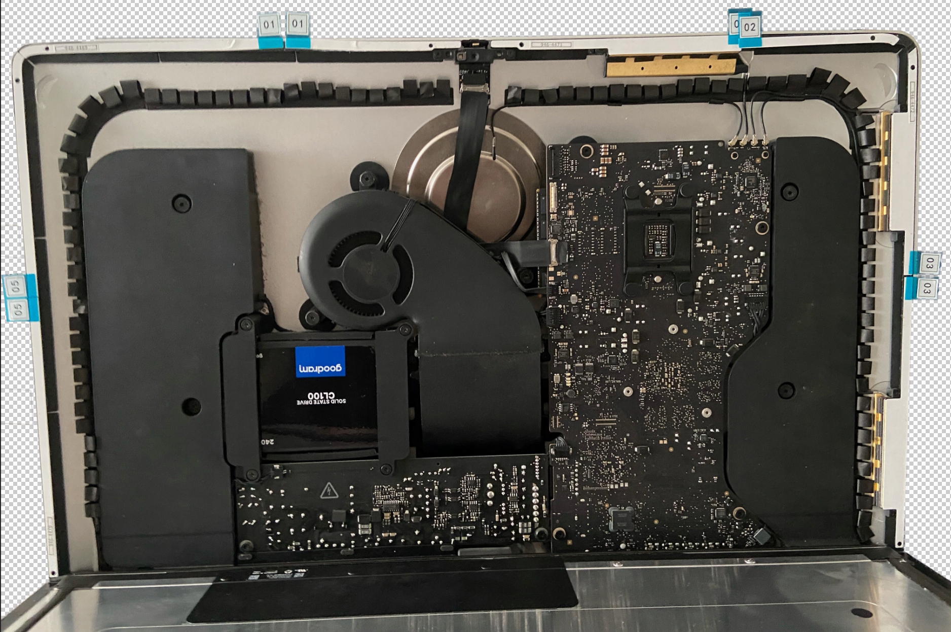 Jest to proste i intuicyjne. Gdy sciągniemy już szybę ukażą nam się boki iMaca na których naklejamy taśmy. Ale najpierw usuwamy stary klej i taśmy.