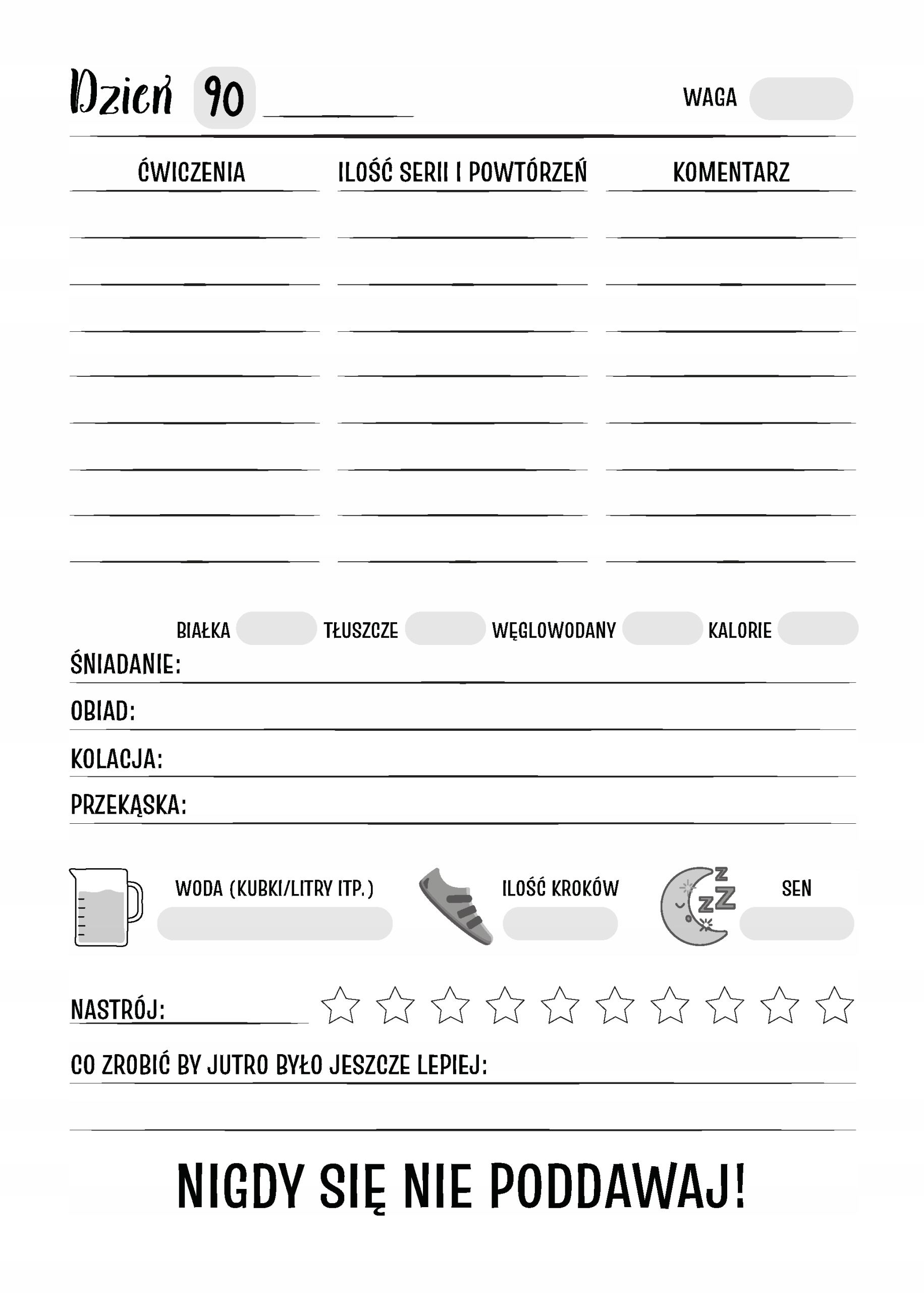 Fitness Planner to dziennik, który pomoże Ci śledzić postępy w twojej pracy nad swoim zdrowiem i sylwetką. Został przygotowany dla łatwego i przyjemnego monitorowania twoich postępów w ciągu 90 dni. Planer posiada dedykowane miejsce dla codziennego zapisywania wykonanych ćwiczeń, spożytych posiłków, ilości wypitej wody, ilości kroków, godzin snu i nie tylko.