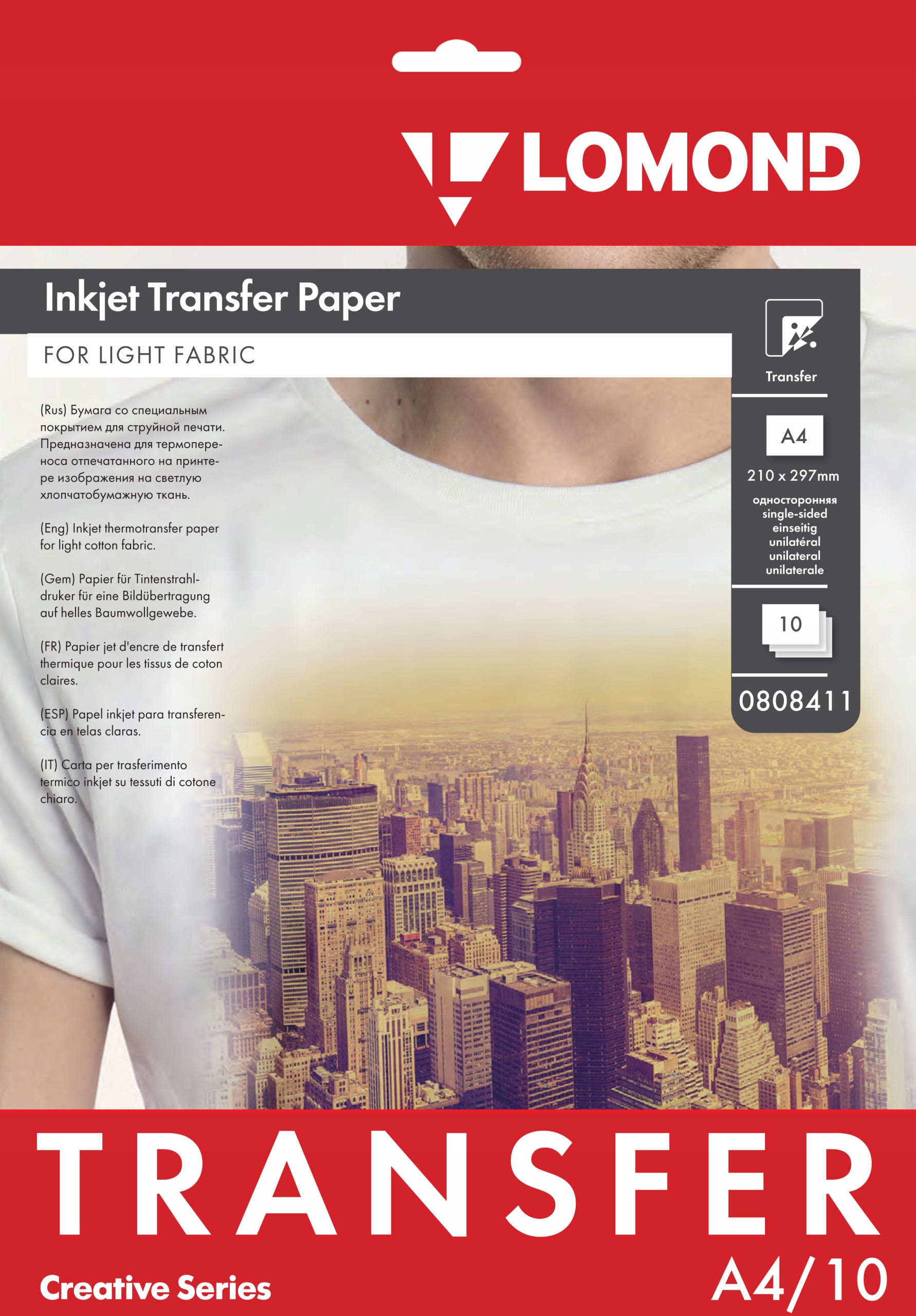 Papier termotransferowy Lomond 0808441 jest przeznaczony do użytku z jasną tkaniną. Pożądany obraz drukowany na drukarce atramentowej (laserowej drukarki nie można używać), z najwyższą jakością 2880 dpi, a następnie wydrukowany obraz jest przenoszony na koszulki (t-shirt) lub po prostu na tkaninę za pomocą prasy termotransferowej lub żelazka.