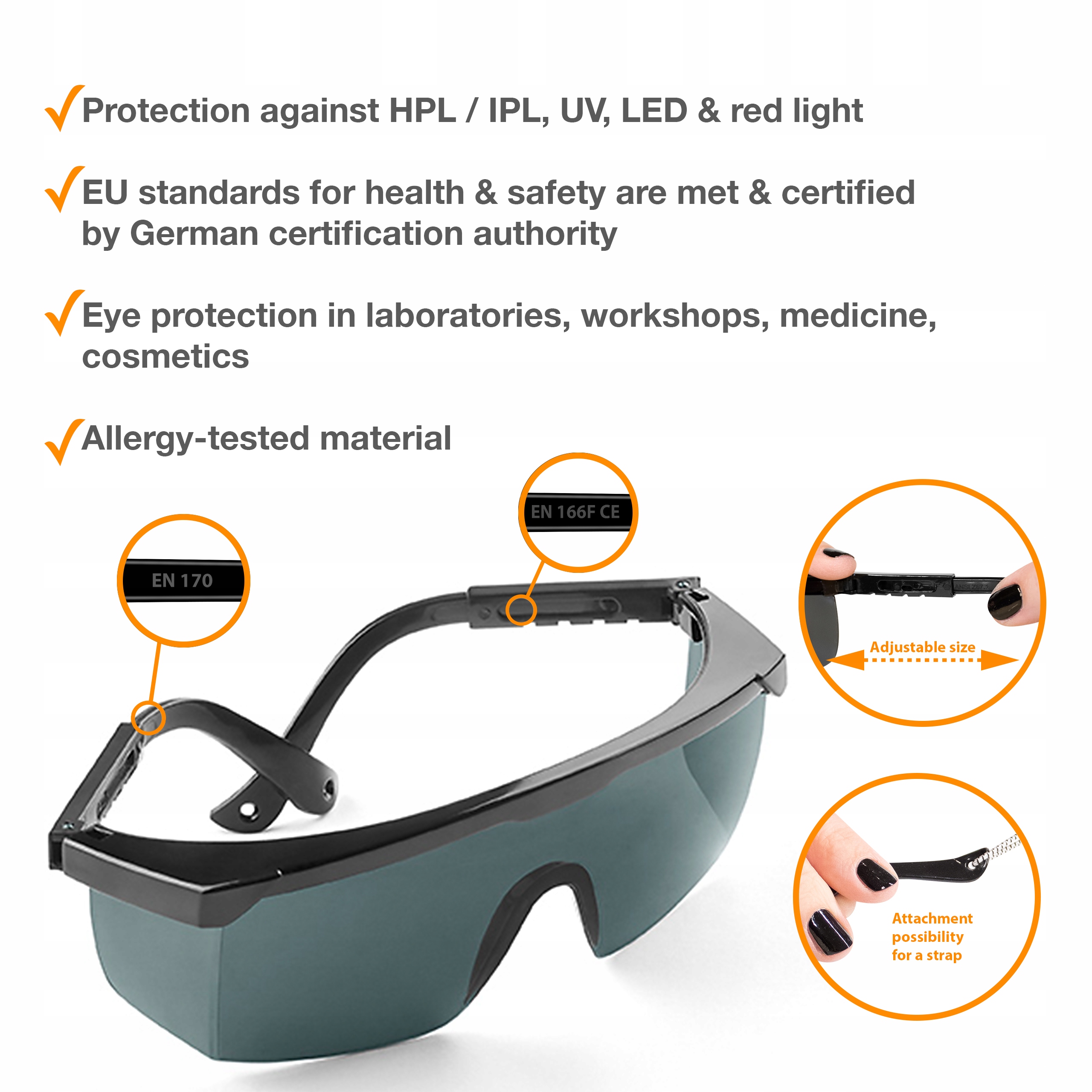 Okulary należy indywidualnie dopasować do wielkości głowy; ustawić właściwą długość zauszników (cztery stopnie regulacji). Powinny przylegać ściśle do twarzy i być stosowane w trakcie wykonywania całego zabiegu. Przechowywać w suchym i chłodnym miejscu, z dala od chemikaliów. Czyścić ciepłą wodą z mydłem.