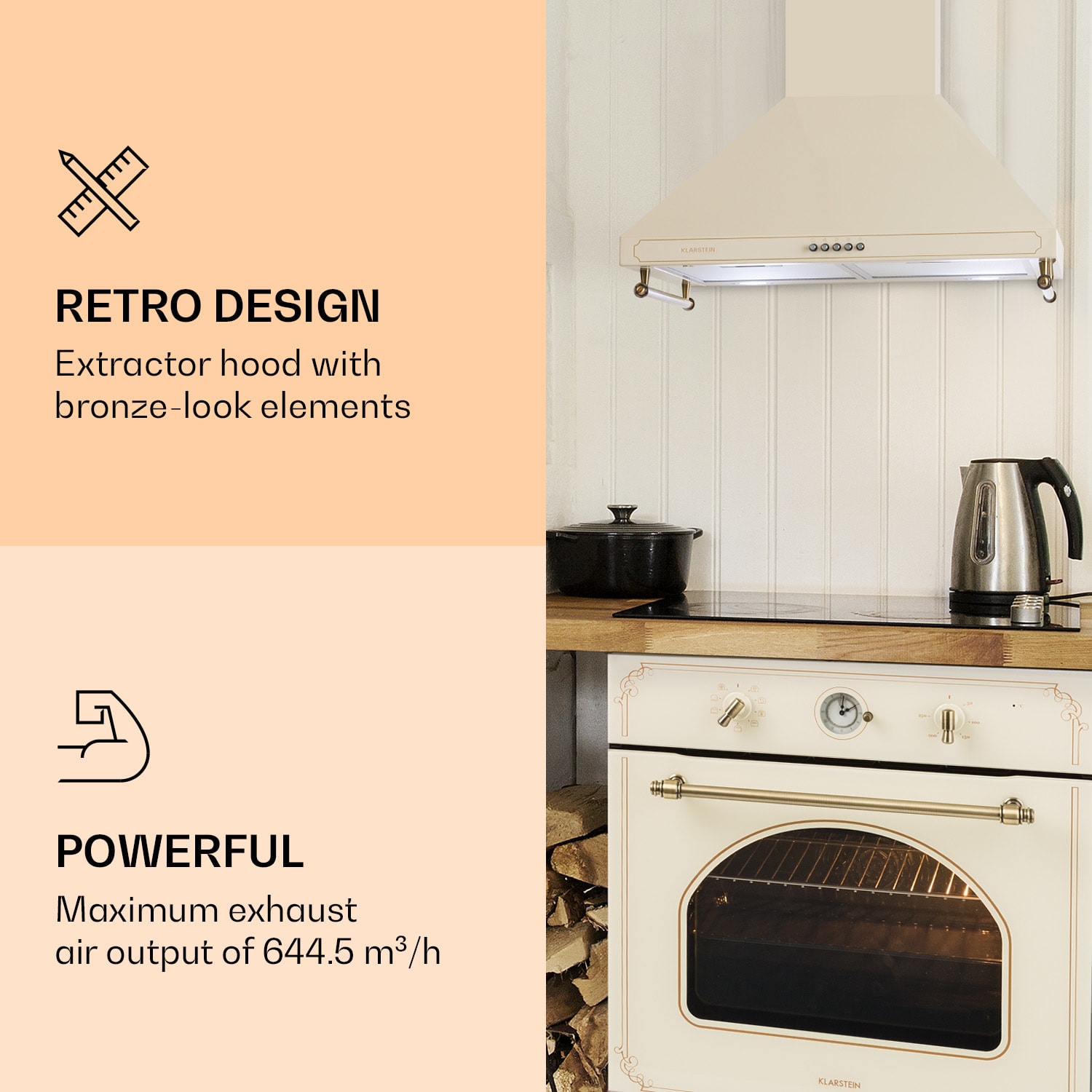 Okap kuchenny Victoria 60 marki Klarstein stanowi piękny akcent w stylu retro i zapewnia dobre powietrze w kuchni.