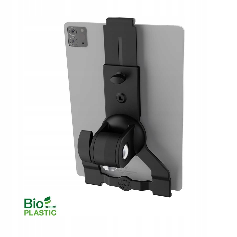 Tworzywa te zawierają od ponad 50% do 100% odnawialnych surowców roślinnych. Wykorzystanie surowców odnawialnych pomaga oszczędzać ograniczone zasoby ropy naftowej i zmniejszać szkodliwe emisje CO2. Więcej informacji o biotworzywach na: bioplastic.k-m.de. Uchwyt nadaje się również szczególnie do tabletów z osłoną ochronną lub etui o grubości do 20 mm. Zachodzące na siebie szczęki zaciskowe ze zintegrowaną gumową podkładką gwarantują pewny chwyt i eliminują niepożądane wibracje.