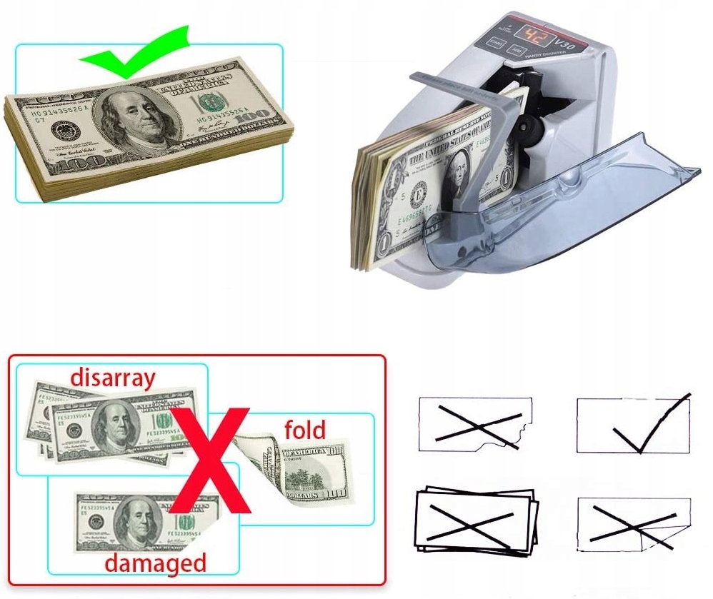 Przed przeliczeniem pieniędzy należy je równo poukładać w pliku, wyrównać zagięcia, usunąć z pliku banknoty uszkodzone