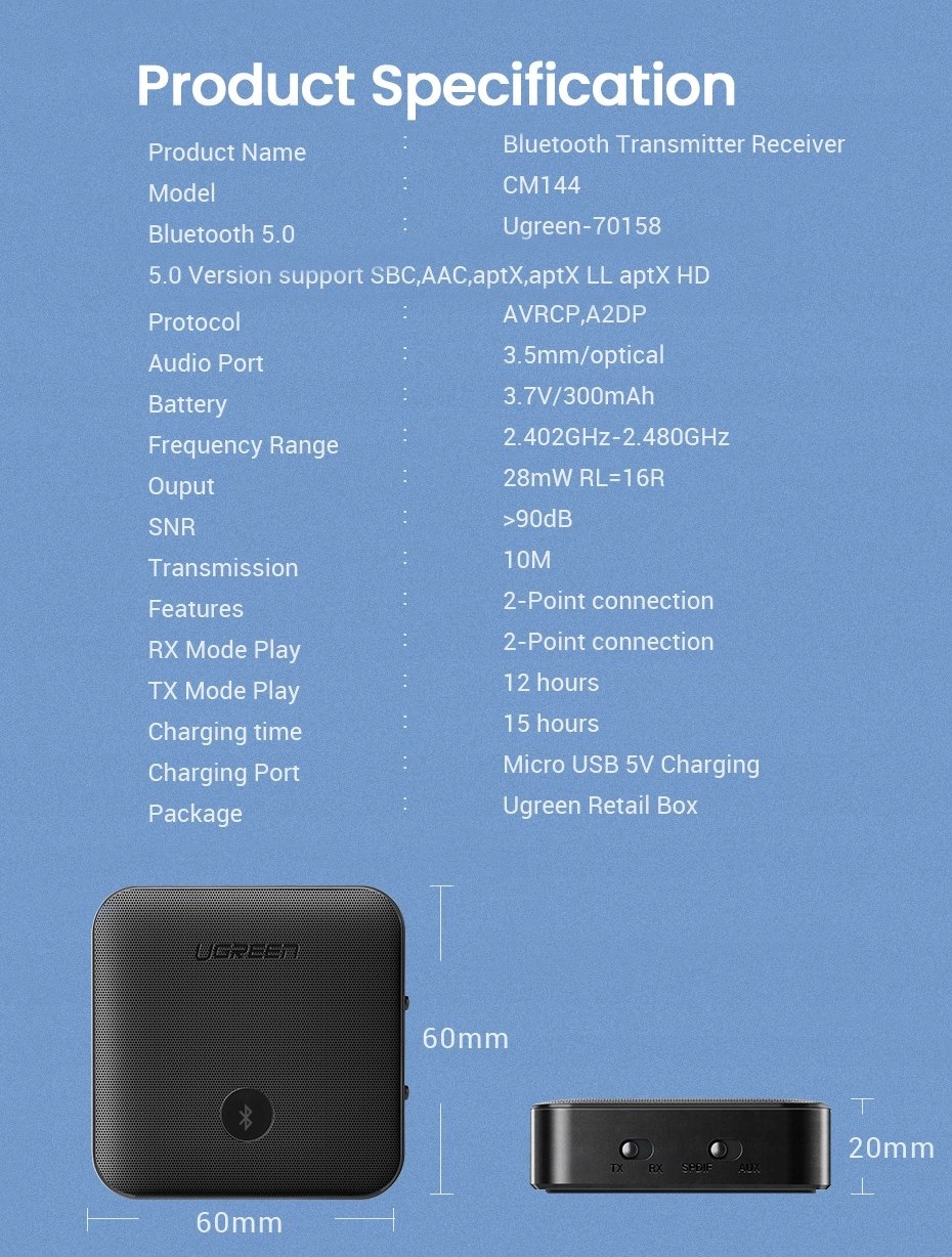 Adapter CM144 jest najbardziej zaawansowanym technicznie urządzeniem UGREEN i jest dedykowany dla najbardziej wymagających odbiorców. Przeznaczeniem adaptera UGREEN jest odbieranie oraz nadawanie muzyki nadawanej przez komunikację Bluetooth z urządzeń takich jak smartfon czy tablet, z i do odbiorników typu amplituner, zestaw głośnikowy lub odtwarzacz car audio. Adapter UREEN obsługuje najnowszy protokół Qualcomm® aptX™ HD.