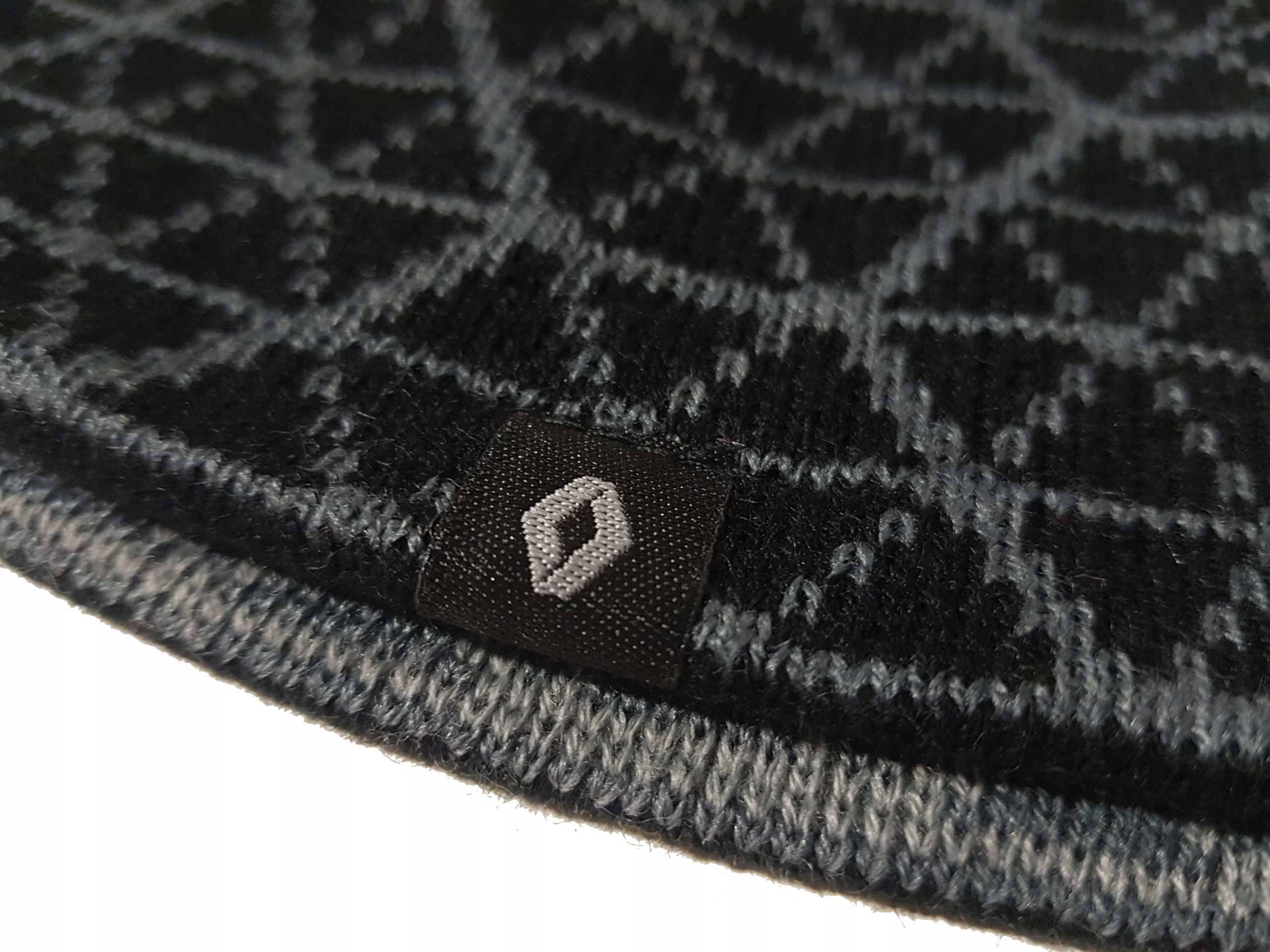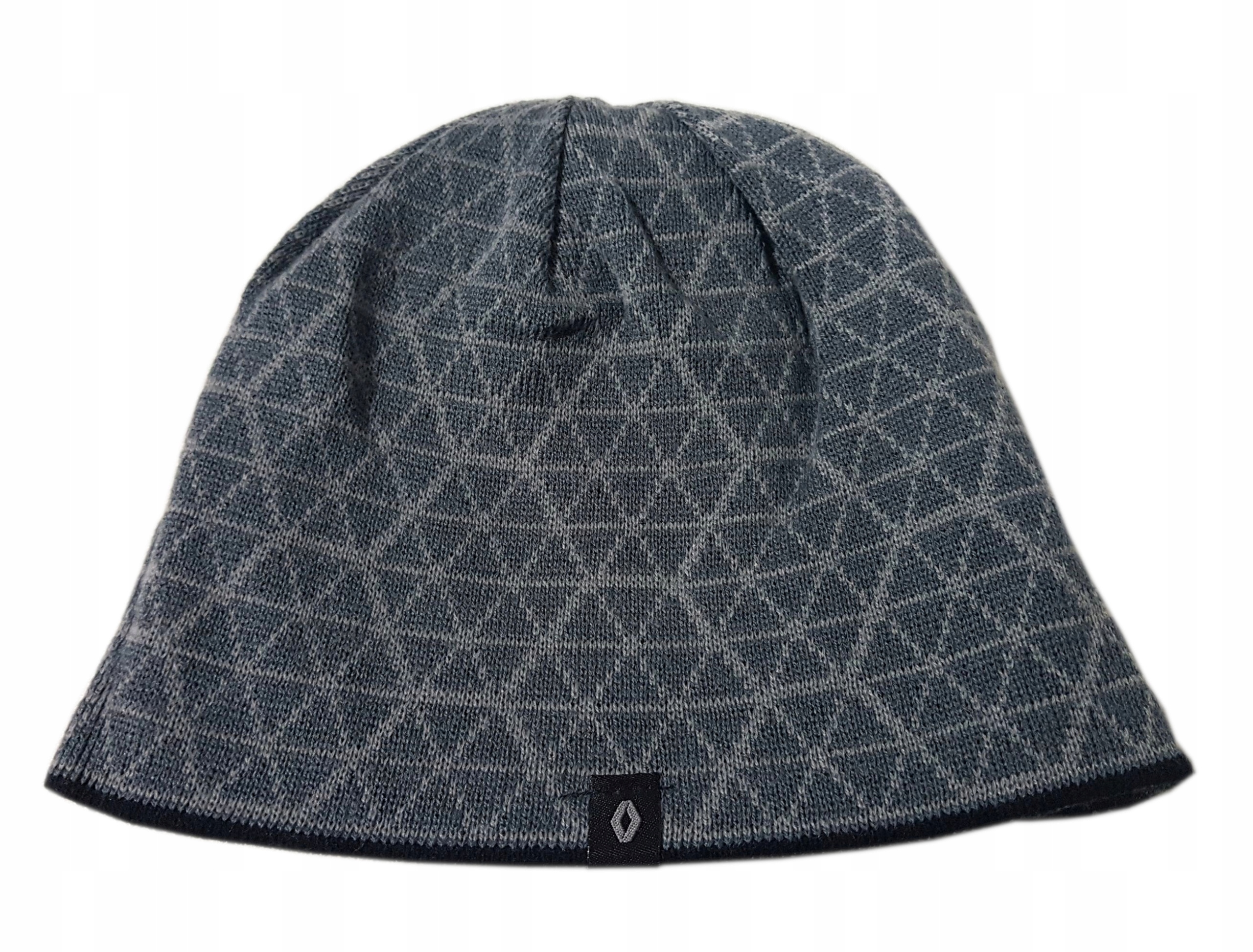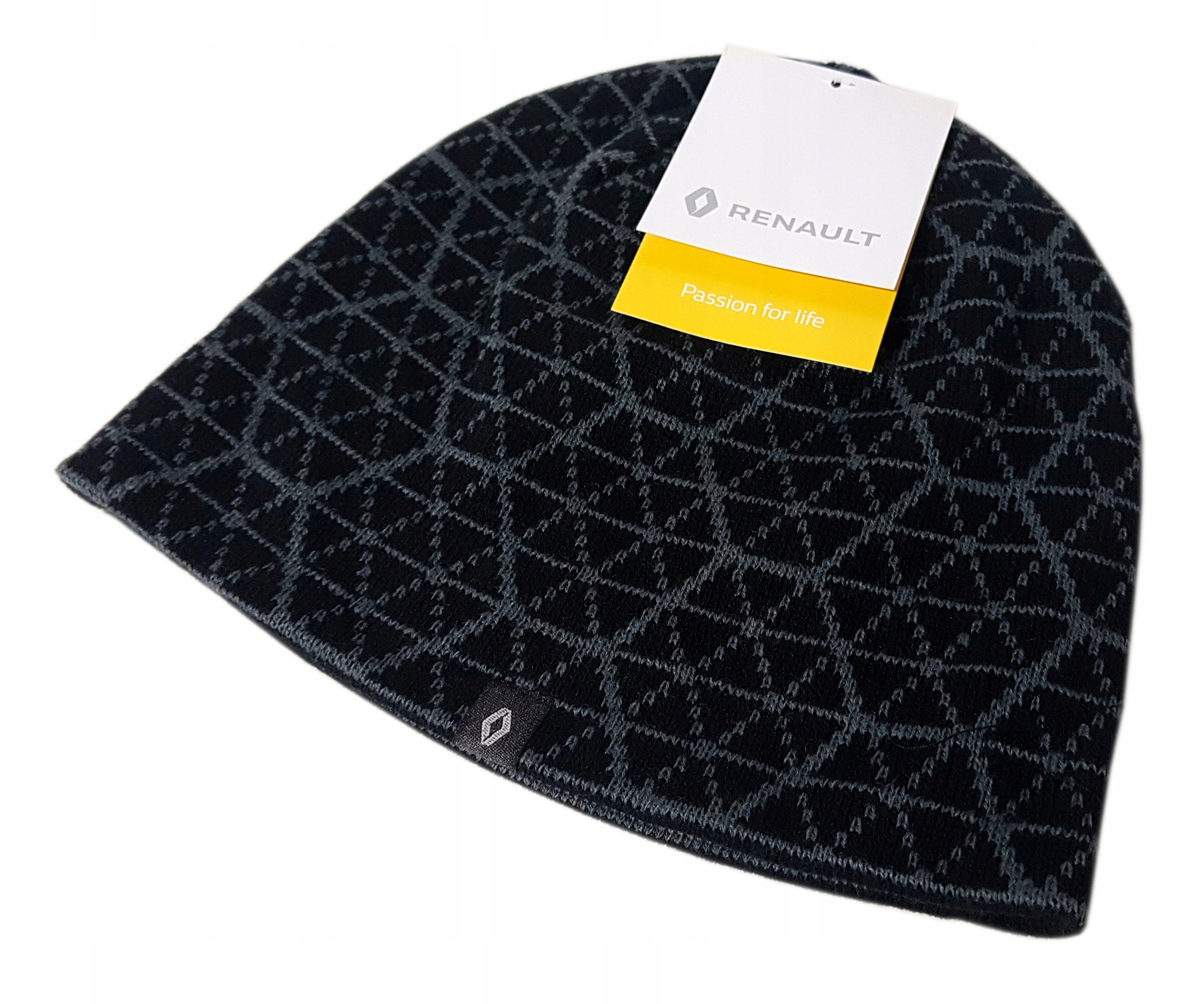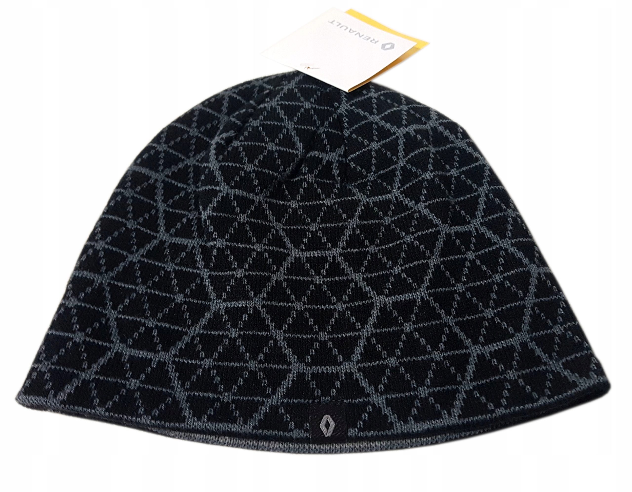 Dwustronna czapka zimowa w kolorze czarnym lub po obróceniu szarym. Na obu stronach widoczna metka z logo Renault