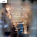 Naklejka na witrynę z godzinami otwarcia o wymiarach 35 x 35 cm. Naklejka jest przygotowana na papierze transportowym do łatwego, samodzielnego montażu na szybie.