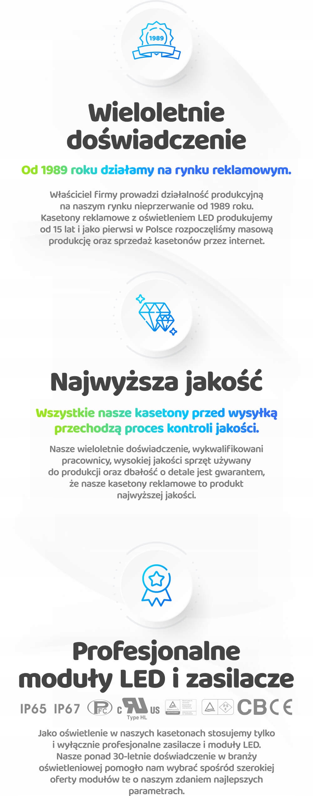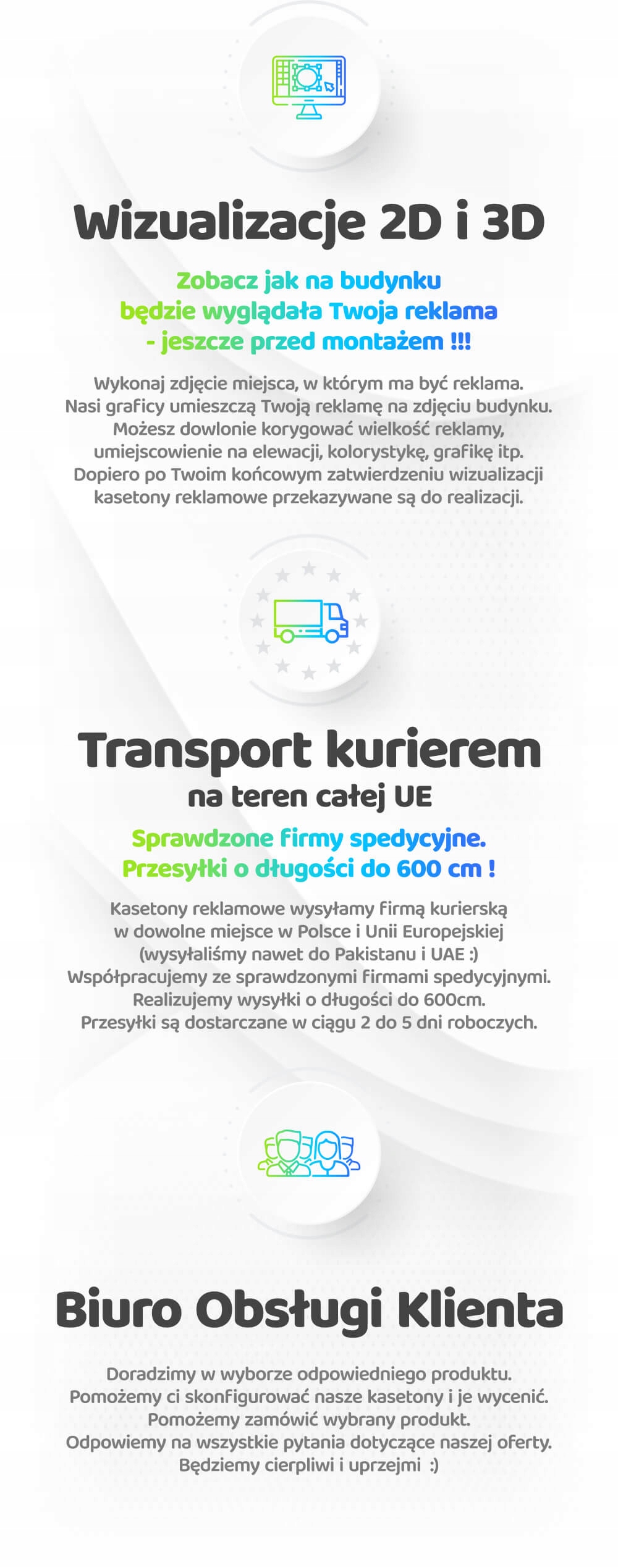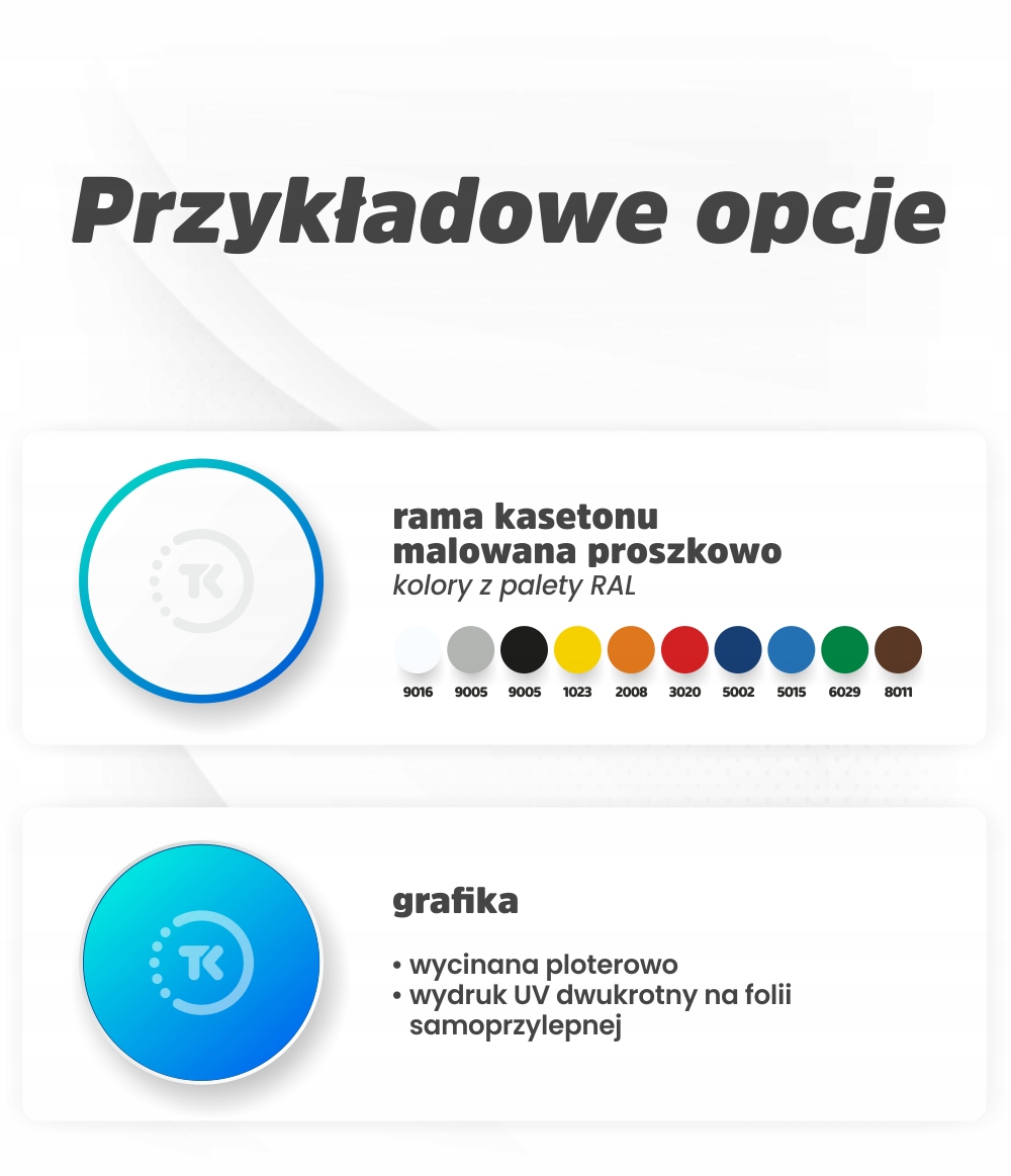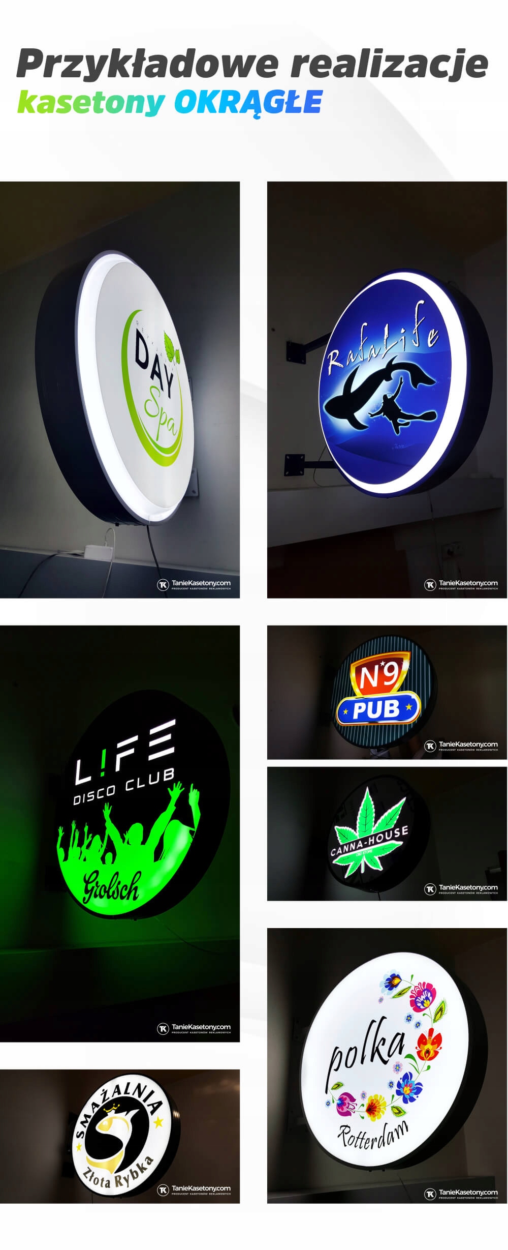 Nasze kasetony świetlne OKRĄGŁE składają się z dwóch elementów z profilu kasetonowego wygiętych pneumatycznie. W ofercie posiadamy kasetony o średnicach 50, 75 i 100 z ramą 10cm oraz 100, 120 i 150 z ramą 14cm w wersjach jedno i dwustronnych. Inne średnice dostępne są przy minimum produkcyjnym 10szt.
