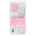 Zestaw narzędzi firmy Silhouette jest wyposażony w haczyk do foli samoprzylepnych oraz foli termicznych, narzędzie scraper do oczyszczania maty lub aplikacji folii na powierzchnie projektowe, szpatułkę do podnoszenia delikatnych wycinanych elementów z maty do cięcia, narzędzie Pick MeUp® do podnoszenia i układania cyrkonii oraz drobnych detali, oraz 15 cm przezroczystą linijkę i ściereczkę z mikrofibry do czyszczenia ekranu LCD urządzenia.