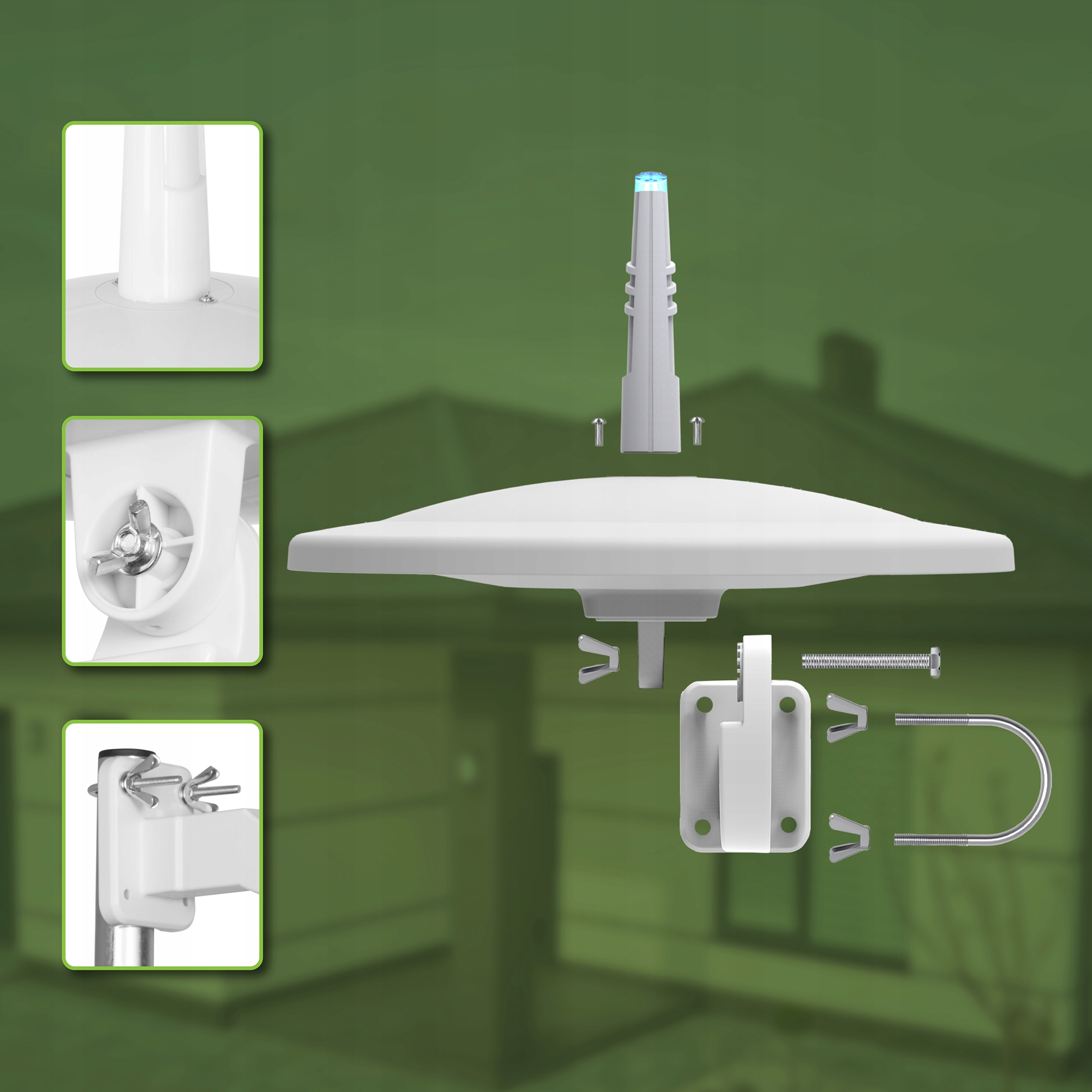 Dzięki dołączonemu do zestawu uchwytowi (regulowany w dwóch płaszczyznach) możesz przewiercić antenę bezpośrednio do elewacji swojego budynku, a dołączony do zestawu cybant pozwoli przykręcić antenę bezpośrednio do masztu antenowego lub barierki balkonowej.