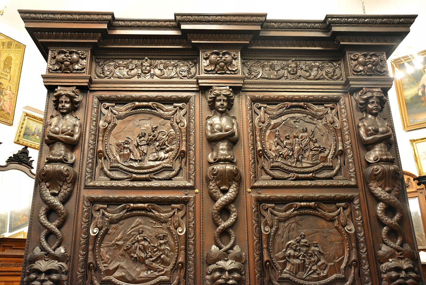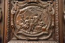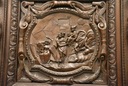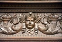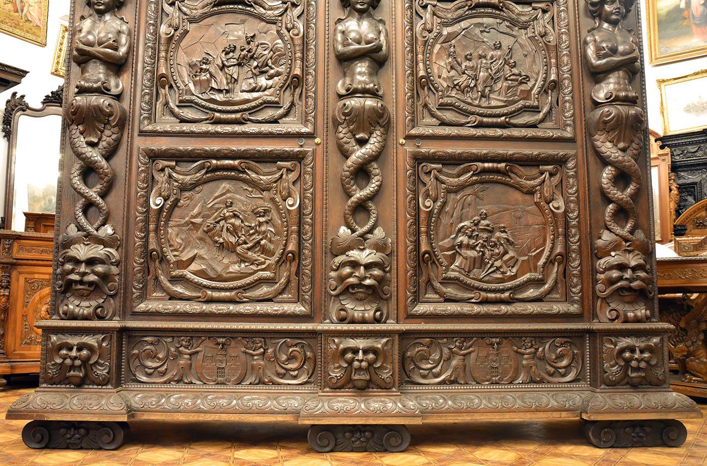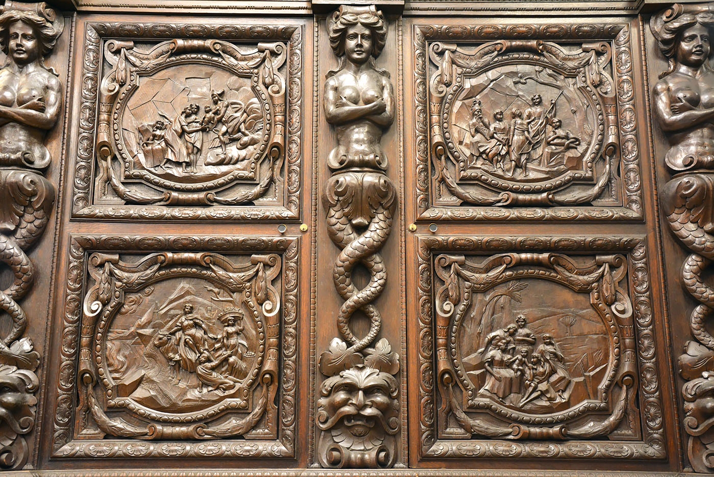Створки дверей, обрамленные по бокам пилястрами, увенчанными мощными фигурами, богато рельефные мифологические сцены и красивые и большие маски маскаронов.