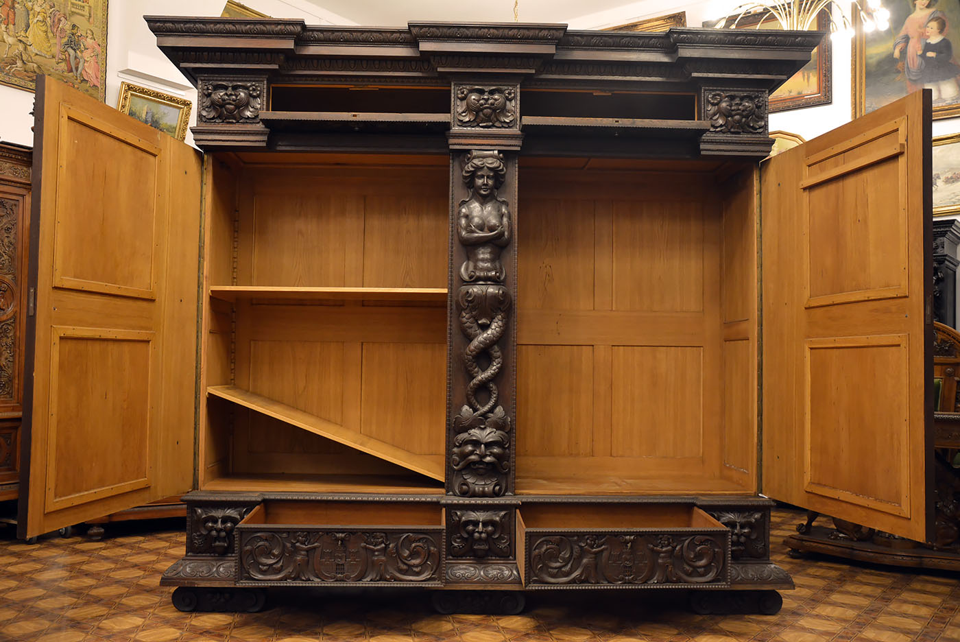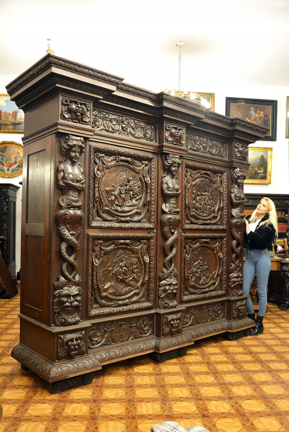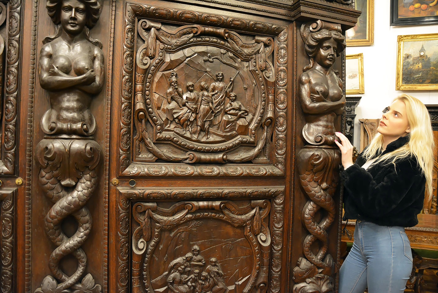 Створки дверей, обрамленные по бокам пилястрами, увенчанными мощными фигурами, богато рельефные мифологические сцены и красивые и большие маски маскаронов.