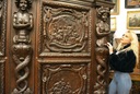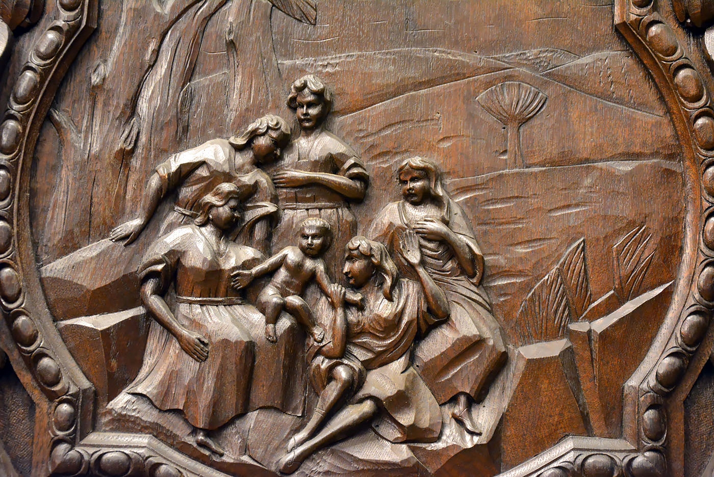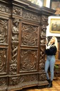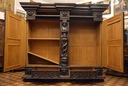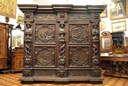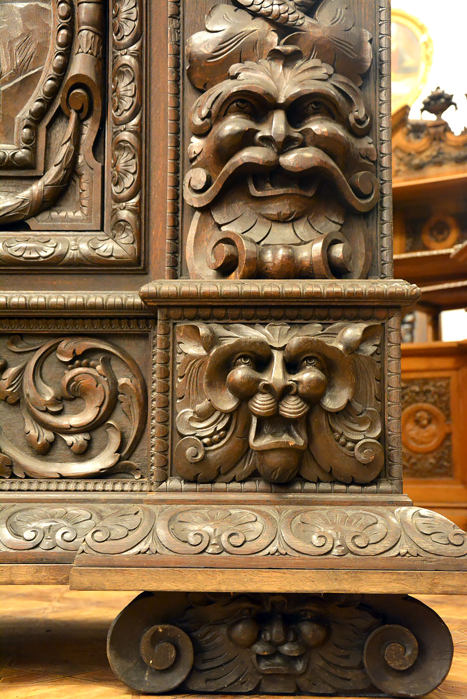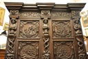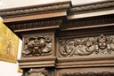 С прямыми сторонами и двустворчатым фасадом, увенчанным профилированным карнизом очень богатый резчик по дереву. Поддерживается широким нижним венком, размещенным на ногах в виде масок машкаронов.