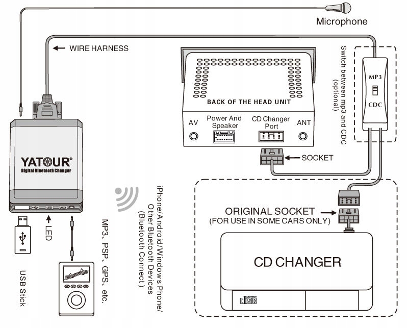 Абсолютно новый комплект / чейнджер Hands-Free от Yatour, позволяет подключать под фирменный плеер в место стандартного чейнджера, ведение телефонных звонков и передача музыки через bluetooth (протокол A2DP), с любого устройства, телефон, ноутбук, планшет и т.д. ,