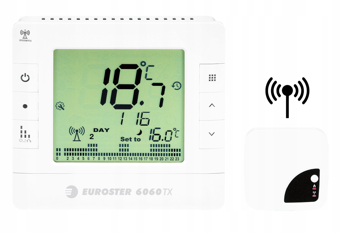 Euroster 6060TXRX to bezprzewodowy, programowany regulator temperatury z dużym, podświetlanym ekranem współpracujący z gazowymi kotłami c.o. oraz innymi urządzeniami grzewczymi. Wyposażony został w wysokiej klasy wyświetlacz LCD z regulowanym kontrastem i przejrzystym menu oraz łatwą nawigacją. Euroster 6060TXRX posiada trzy predefiniowane nastawy temperatury: "komfortowa", "ekonomiczna", "obniżona", a także szereg użytecznych funkcji, np.: chwilowa nastawa temperatury, funkcja blokady klawiatury, temperatura stała, tryb wakacyjny, czy sygnalizacja rozładowanych baterii.