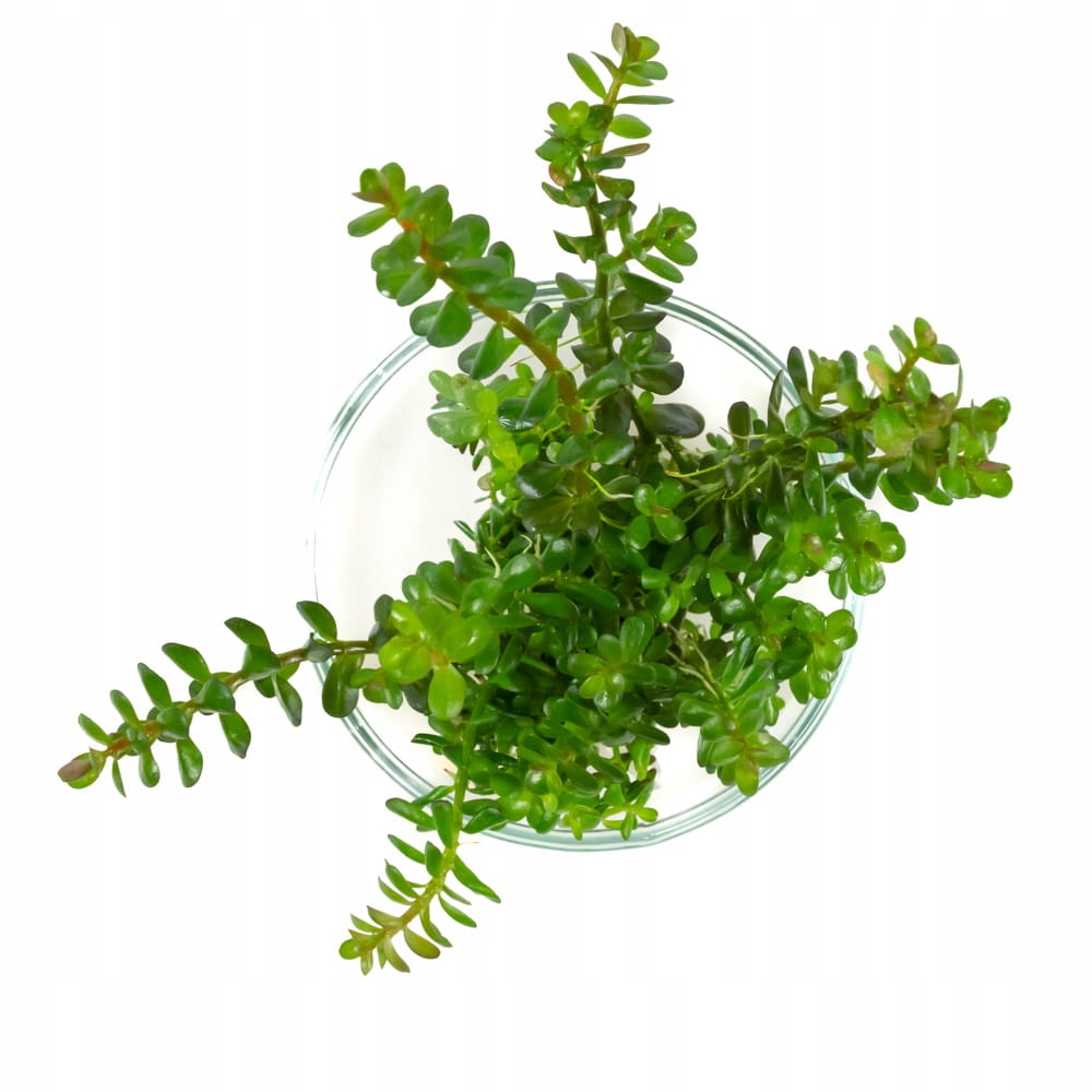 Rotala rotundifolia-красивое растение для среднего или заднего плана. Листья тонкие и длинные, длиной до 2 см и шириной до 4 мм. Растут парами, напротив. Подводные листья узко-ланцетные, а надводные круглые. Надводные побеги развивают цветы бледно-розового цвета, собранные в простое колосовидное соцветие. Цвет растения зависит от мощности освещения. В тускло освещенных водохранилищ зеленый, а при сильном освещении окрашивается в оранжевый цвет до красного. Размножается растение стеблевыми ветвями . Сажать следует в плодородный субстрат. Систематически обрезанный, он образует красивую плотную форму.