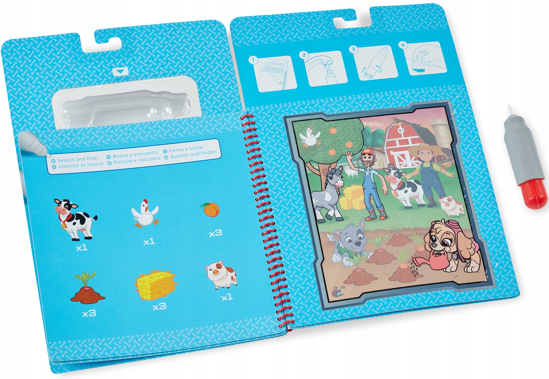 Książeczka z czterema obrazeczkami na kółkach, dzięki czemu strony łatwo się obracają + specjalny długopis w formie pędzelka - wystarczy nalać odrobine wody do środka i malujemy.
