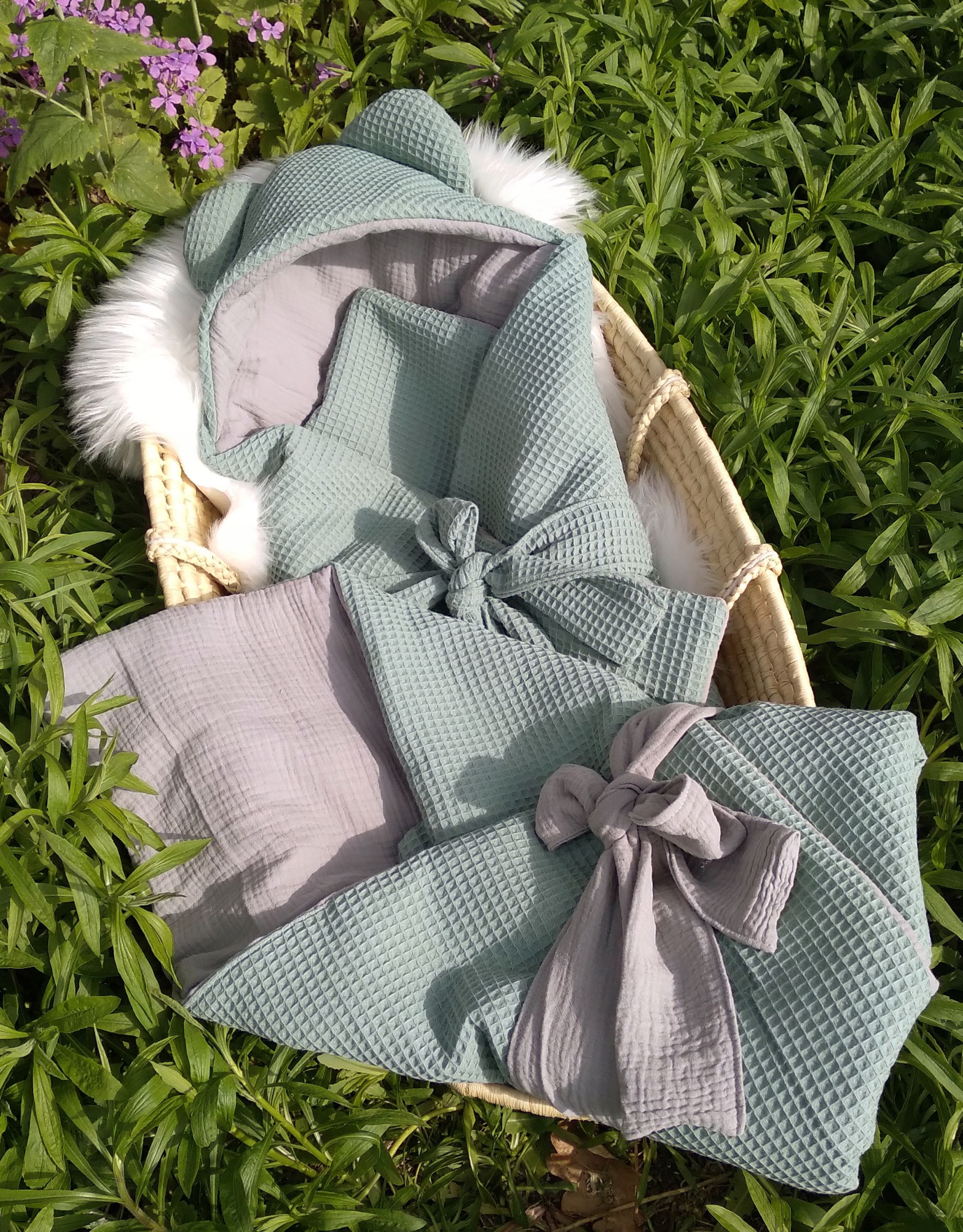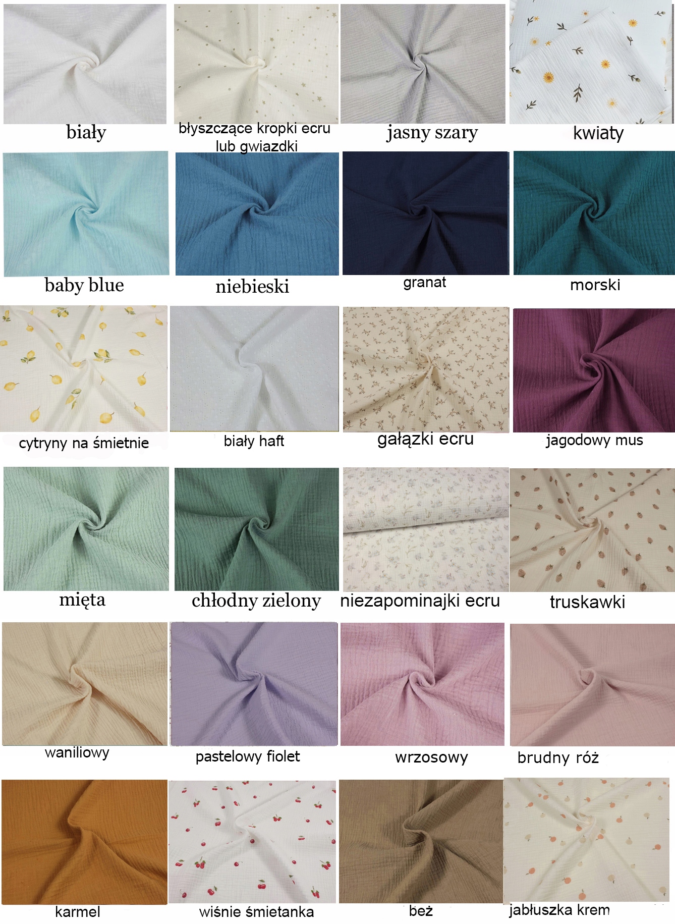 Proszę wybrać kolory dostępnego muślinu oraz wafelka i napisać w wiadomości do sprzedającego: