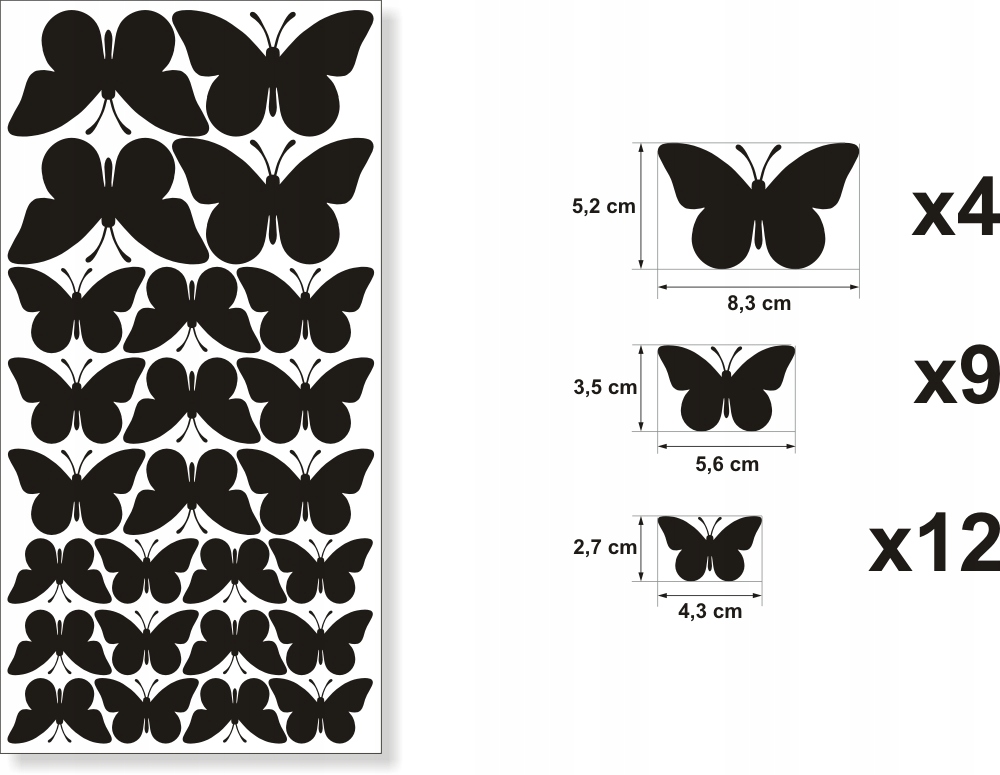 Бабочки размещаются на листе размером 30 см х 15 см (в зависимости от формы доставка, он может быть разделен на более мелкие части). Всего на нем 25 шт. бабочек в три размера: 12 шт. малый, 9 шт. средних, 4 шт. больших.