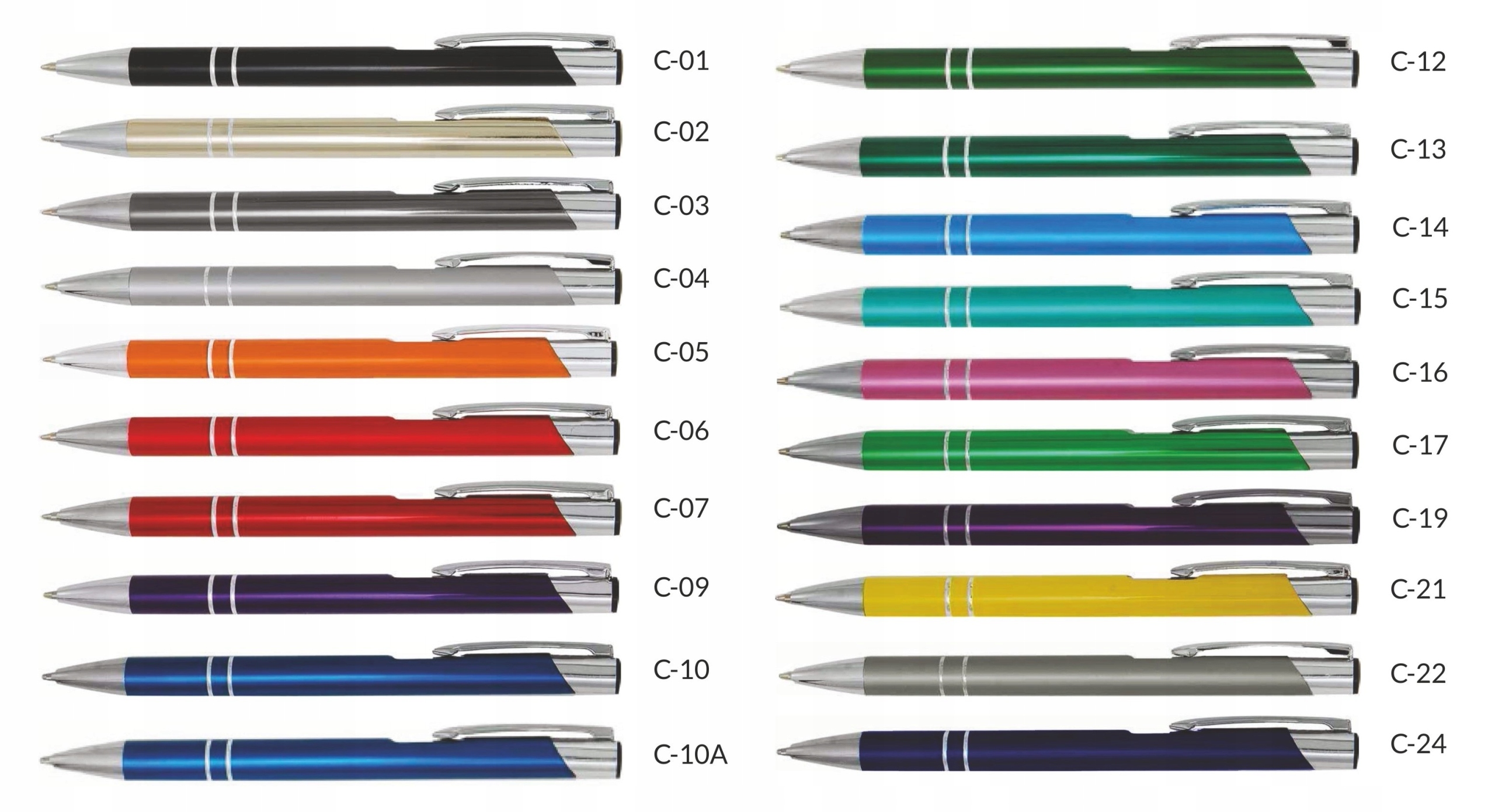 Długopisy są znakowane przez nas metodą grawera. Znakowanie tą metodą polega na „wypaleniu” kolorowej warstwy lakieru, odsłaniając "wnętrze" długopisu. Nie mamy wpływu na kolor znakowania – grawer jest zazwyczaj biały (wyjątek stanowią kolory: C-21 żółty – wersja lakier oraz C-20 biały – wersja lakier - tutaj grawer jest srebrny).