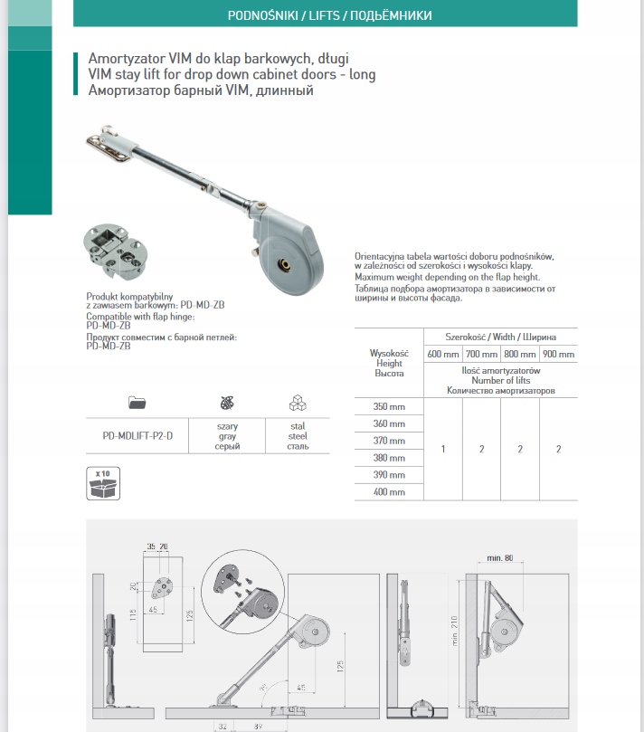 Produkt do zastosowania w klapach otwieranych do dołu (barkowych), dostępny w dwóch rozmiarach. Podnośniki VIM są uniwersalne, można je montować zarówno z prawej, jak i z lewej strony oraz regulować kąt otwarcia klapy. Dzięki funkcji spowolnienia front otwiera się płynnie, amortyzując opadanie klapy. Podnośnik w zestawieniu z zawiasem barkowym gwarantuje stabilność połączenia oraz podnosi estetykę wykończenia wnętrza szafki.