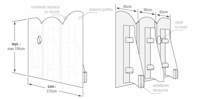 3. Z dwustronną grafiką i stalową podporą łukową: w formatach granicznych (szer.xwys.) 95x95, 95x145, 95x195cm