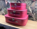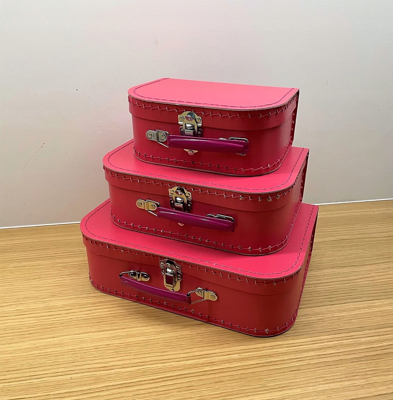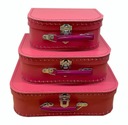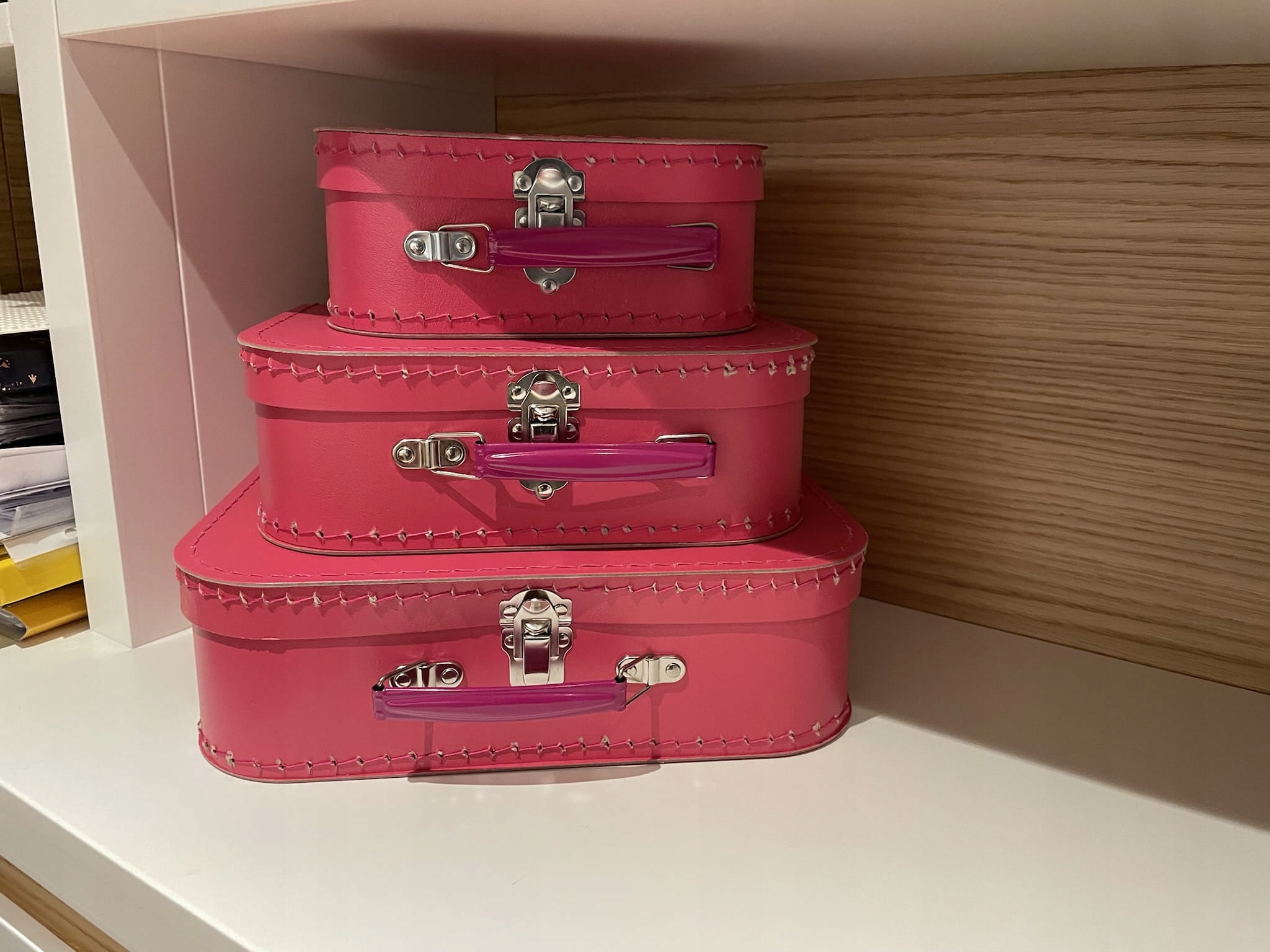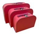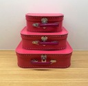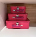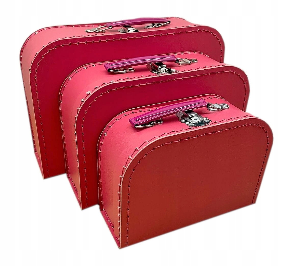 Malinowe walizeczki to zestaw kapitalnych kuferków dziecięcych w pięknym malinowym kolorze z rączką w podobnym malinowym kolorze i metalowym zatrzaskiem.