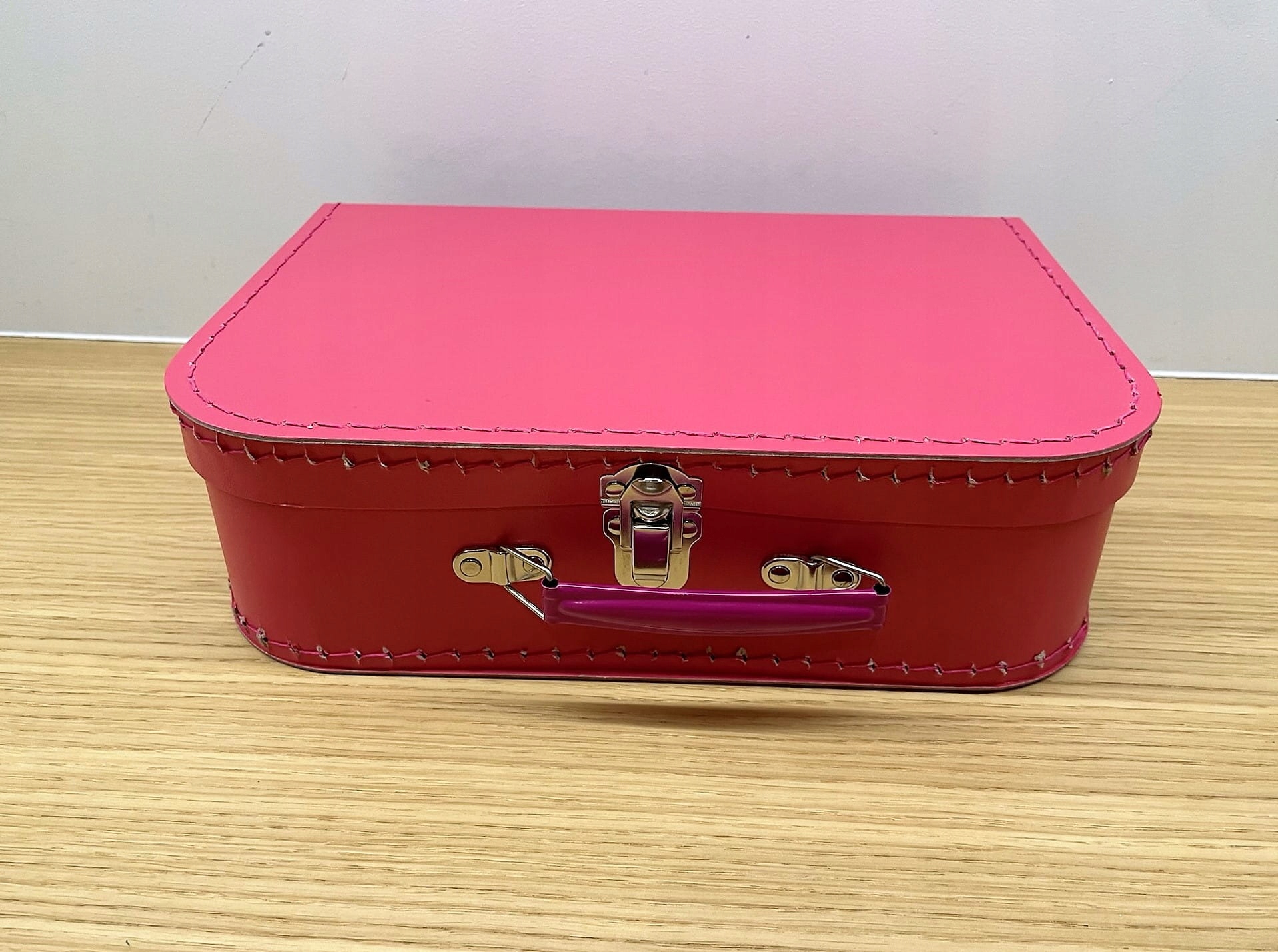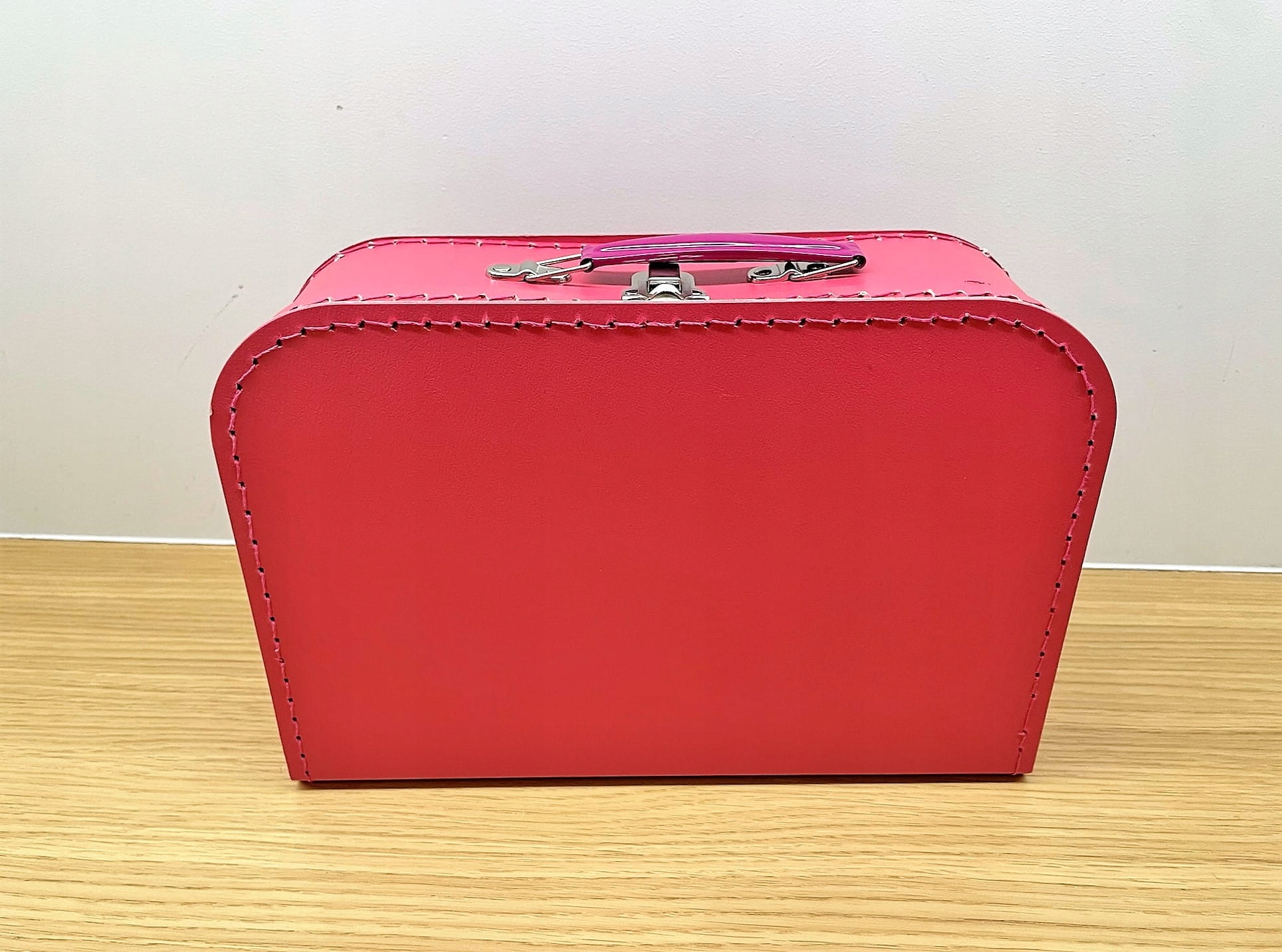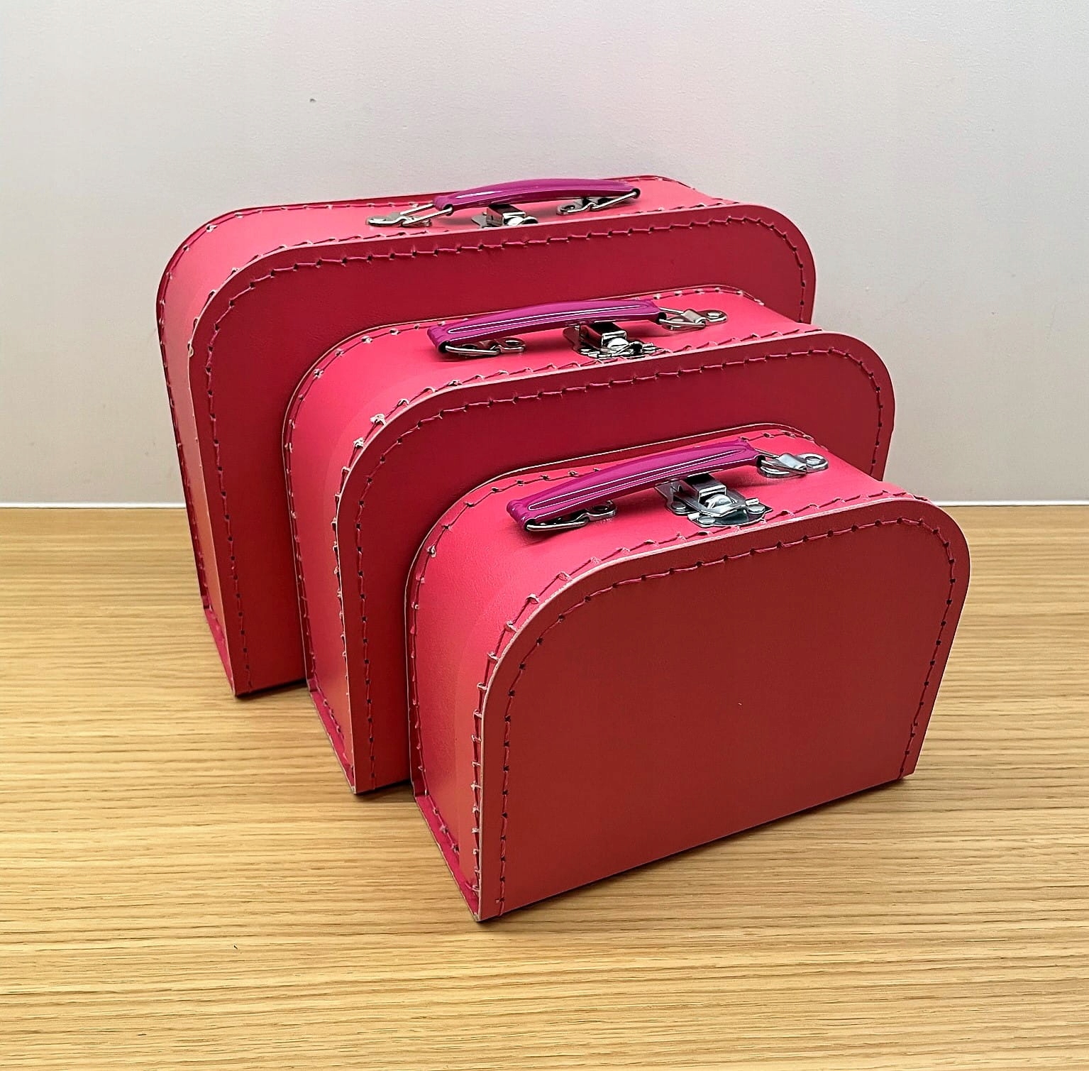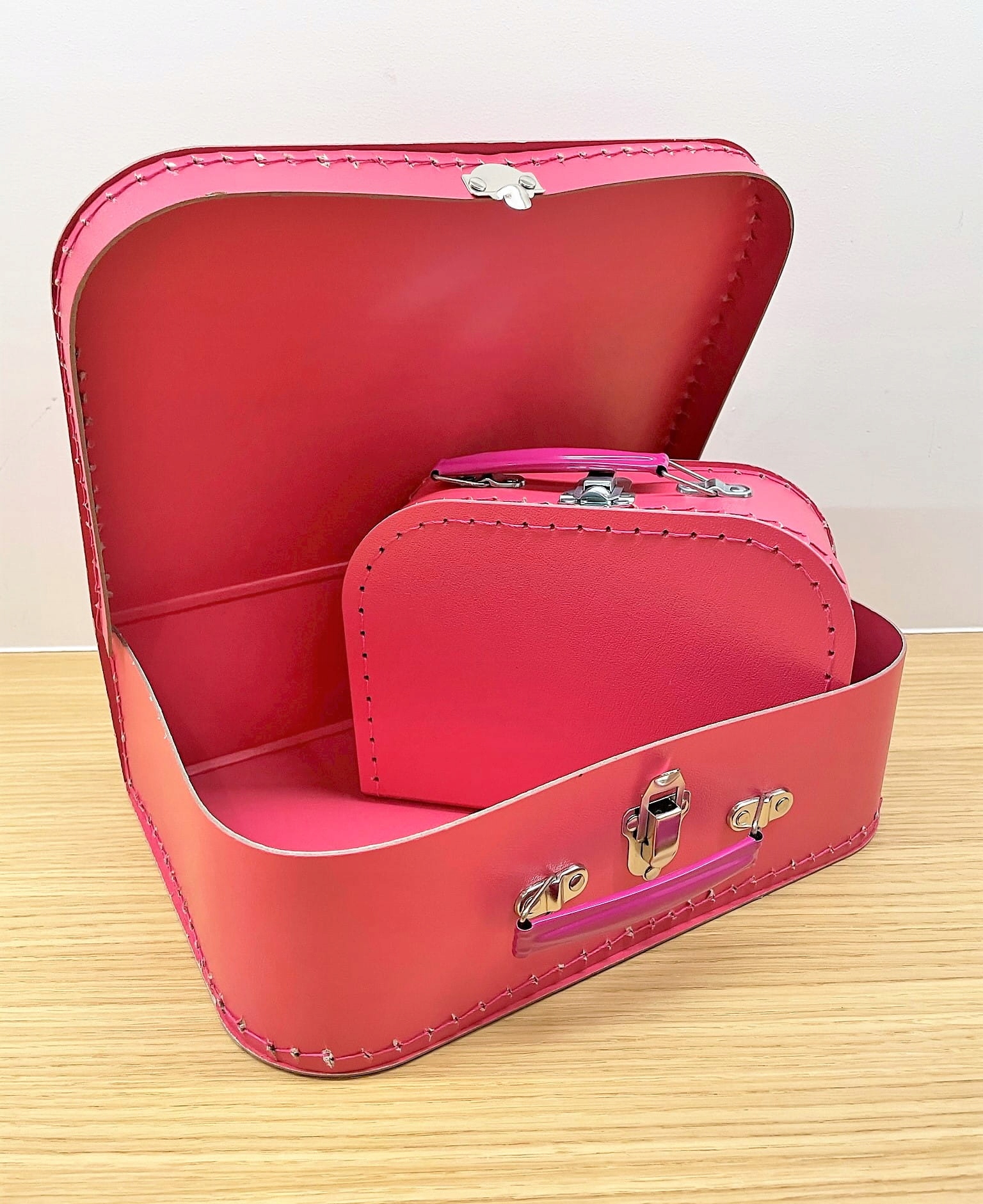 Malinowe walizeczki to zestaw kapitalnych kuferków dziecięcych w pięknym malinowym kolorze z rączką w podobnym malinowym kolorze i metalowym zatrzaskiem.
