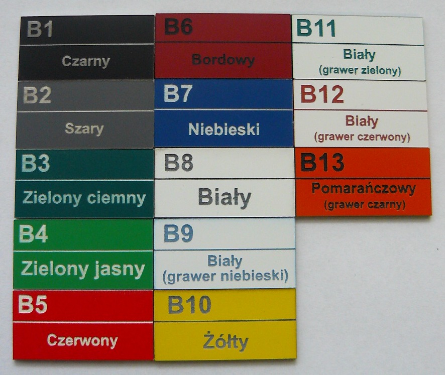 Istnieje możliwość wyboru koloru laminatu grawerskiego (numerki na powyższym zdjęciu wykonano w kolorze B1) :