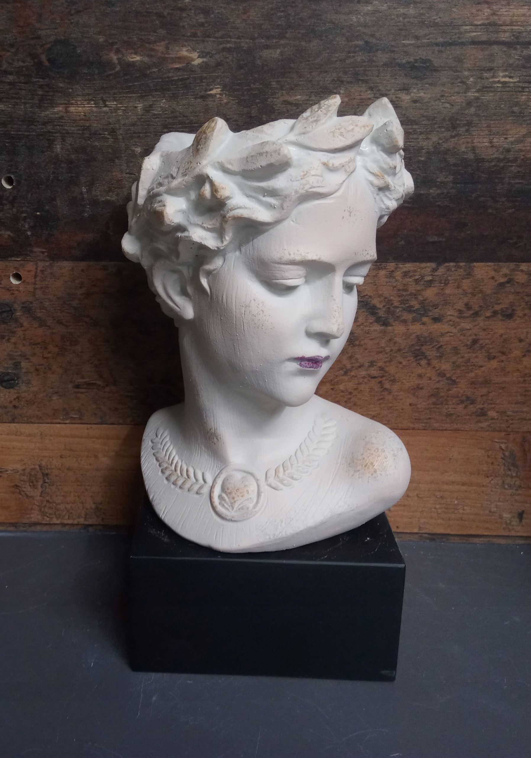 Doniczka-osłonka.Antyczna głowa kobiety.Pojemnik na bibeloty.Wysokość 26cm.Szerokość 18cm.Otwór na doniczkę ma12cm.Materiał:konglomerat kamienno-cementowy.Kolor cielisty.Sprzedaż bez cokołu.
