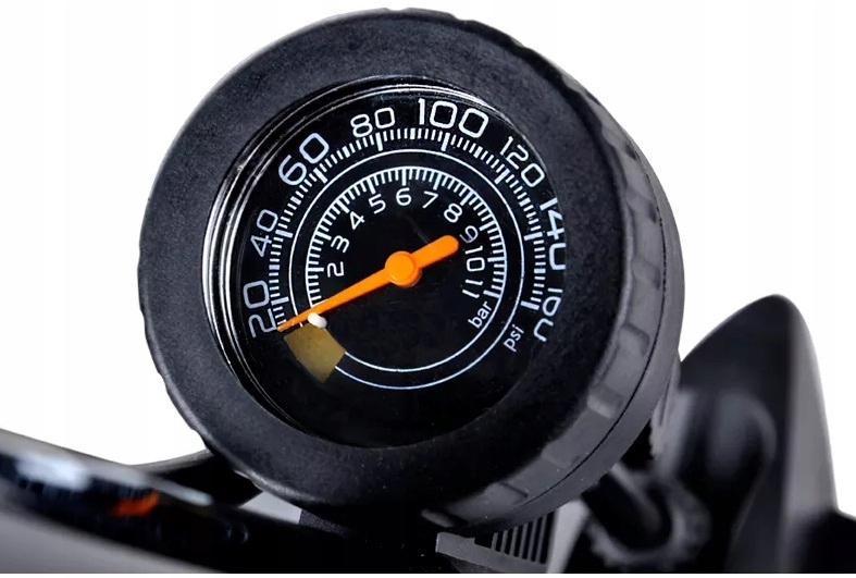 ✅ Pompka posiada wbudowany manometr wyskalowany aż do 11 BAR / 160 PSI, co pozwala na bieżące kontrolowanie i uzyskanie pożądanego ciśnienia!