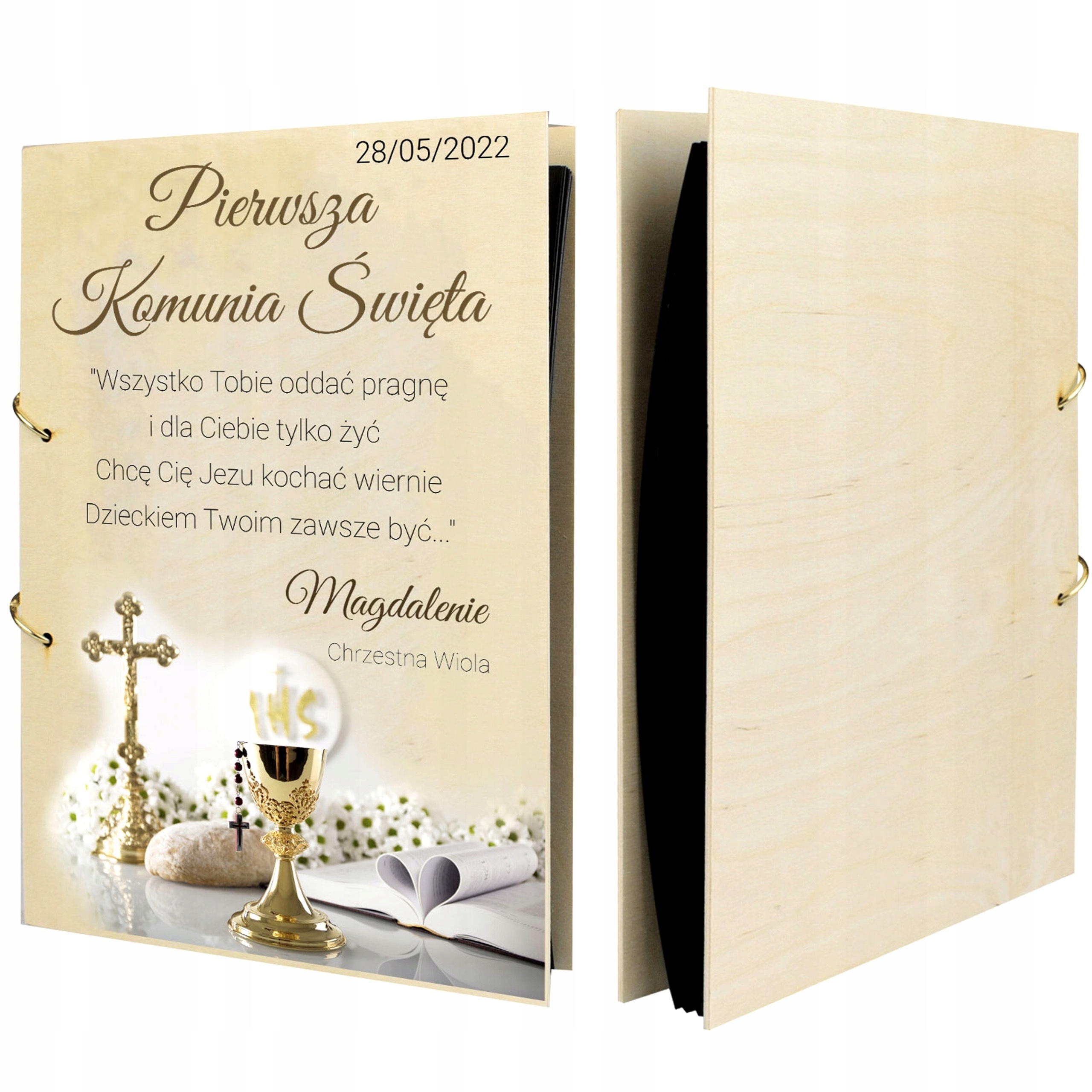 Drewniany album z nadrukiem to idealny prezent, który podarujesz dziecku z okazji Komunii. Jest to wyjątkowy prezent, który będzie w przyszłości miłym wspomnieniem.