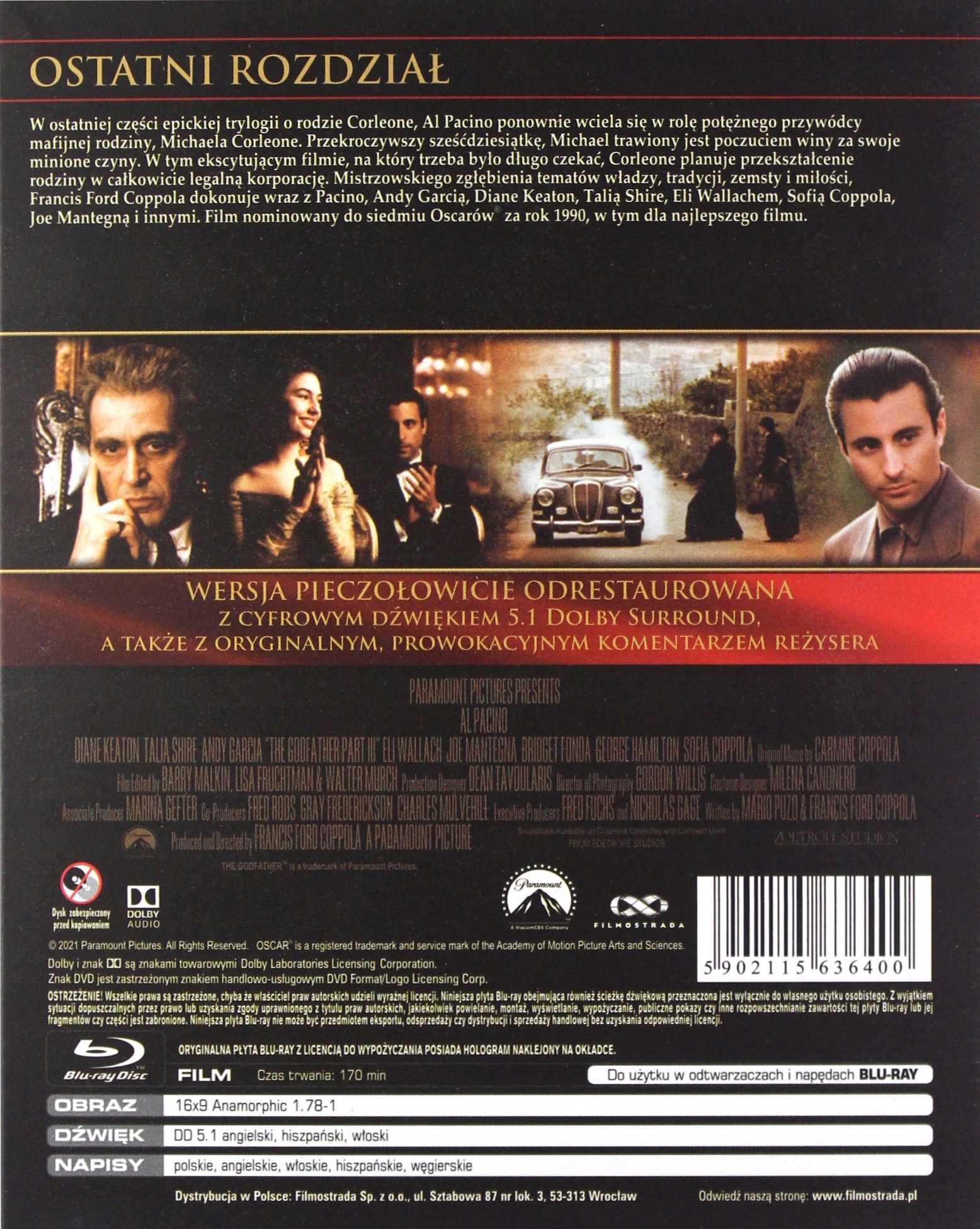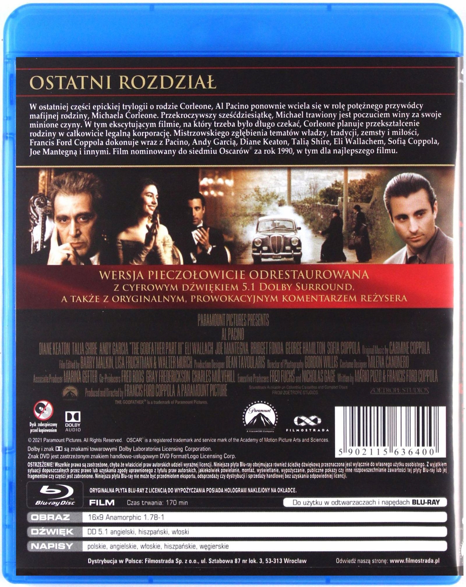 W ostatniej części epickiej trylogii o rodzie Corleone, Al Pacino ponownie wciela się w rolę potężnego przywódcy mafijnej rodziny, Michaela Corleone. Przekroczywszy sześćdziesiątkę, Michael trawiony jest poczuciem winy za swoje minione czyny. W tym ekscytującym filmie, na który trzeba było długo czekać, Corleone planuje przekształcenie rodziny w całkowicie legalną korporację. Mistrzowskiego zgłębienia tematów władzy, tradycji, zemsty i miłości, Francis Ford Coppola dokonuje wraz z Pacino, Andy Garcią, Diane Keaton, Talią Shire, Eli Wallachem, Sofią Coppola, Joe Mantegną i innymi. Film nominowany do siedmiu Oscarów? za rok 1990, w tym dla najlepszego filmu.
