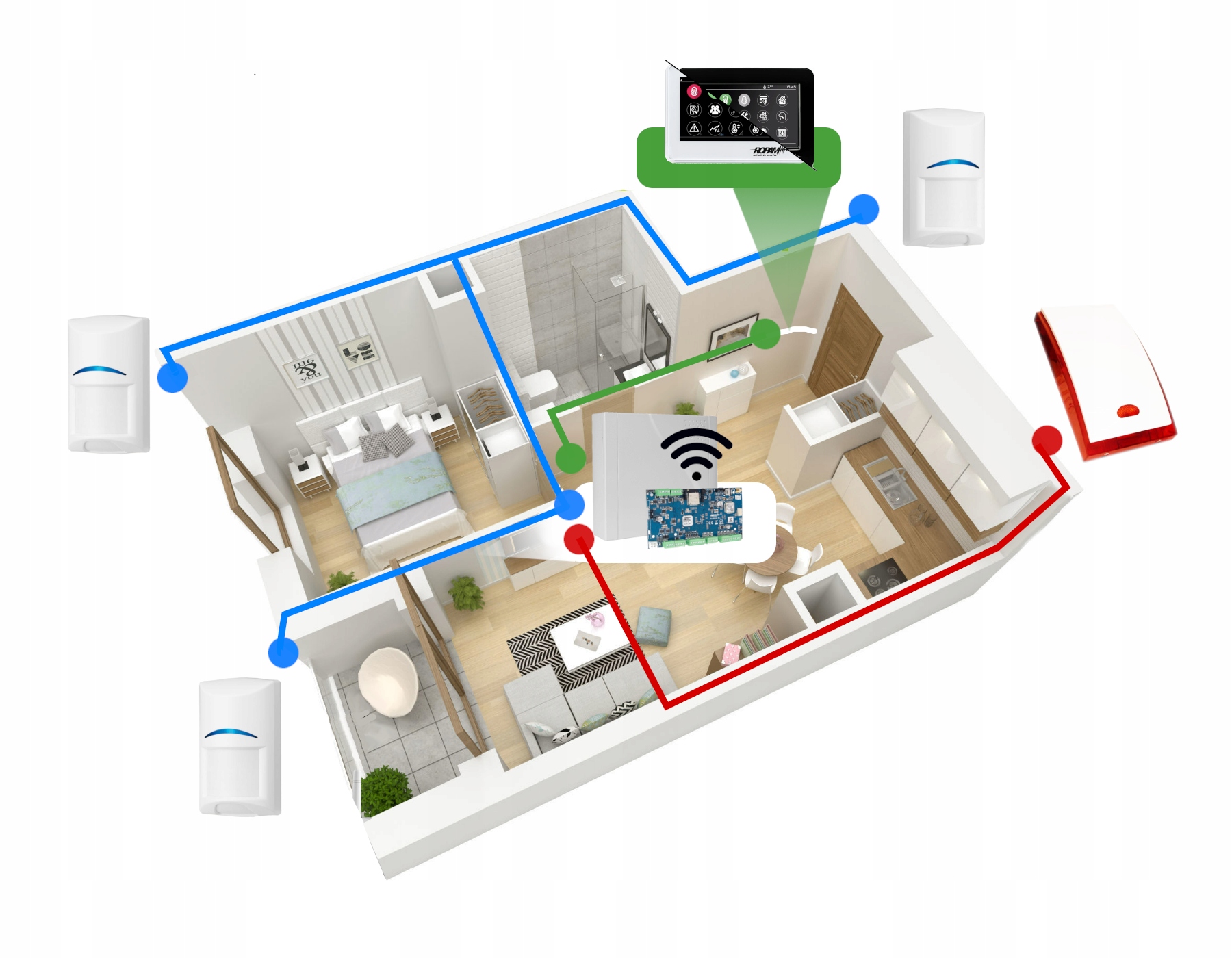 Płyta główna systemu wyposażona jest we wbudowany moduł WiFi oraz komunikator GSM/GPRS, za pomocą których może automatycznie powiadamiać użytkownika o zdarzeniach (za pomocą bezpłatnej aplikacji RopamDroid dla telefonów wyposażonych w system Android) lub przekazywać informacje do centrum monitoringu firmy zajmującej się ochroną.