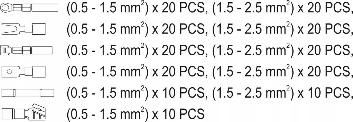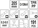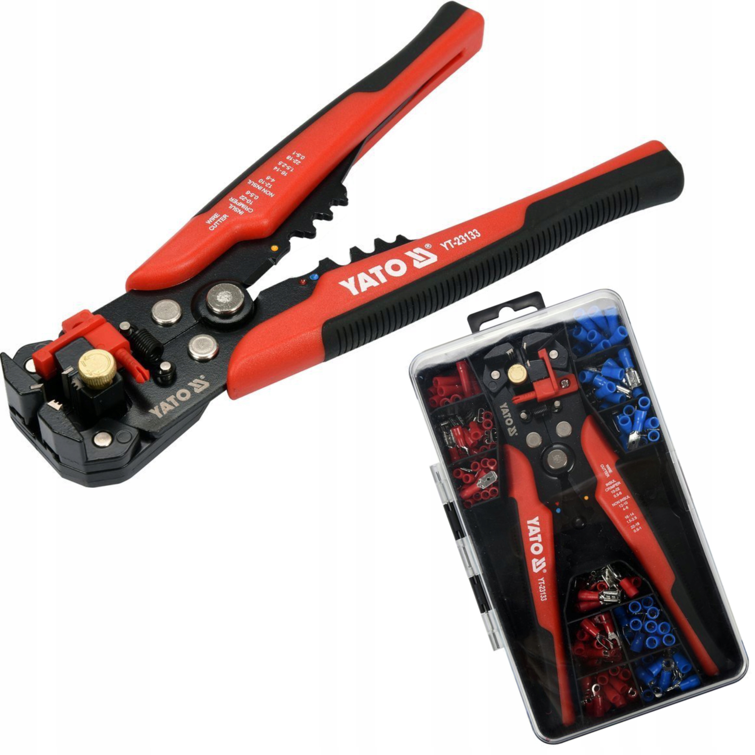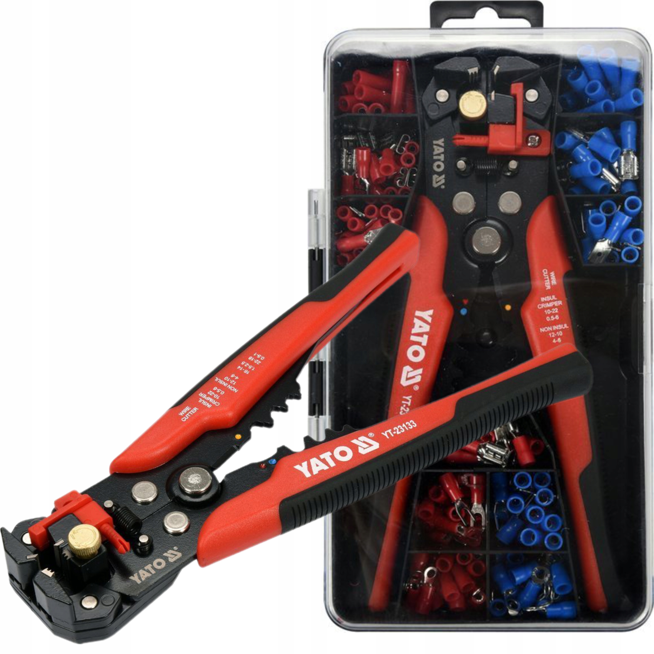 Zestaw konektorów izolowanych z wielofunkcyjnymi szczypcami YT-23133. Korpus szczypiec wykonano ze stali A3, a elementy ściągające izolację z wytrzymałej hartowanej stali narzędziowej ze stopu Cr12MoV. Rękojeści zabezpieczone dwukomponentowymi nakładkami z tworzywa sztucznego. Twardszy komponent z PP mocno przylega do korpusu, a zewnętrza część z TPR jest przyjemna w dotyku i posiada antypoślizgowe właściwości. Szczypce zabezpieczono przed korozją za pomocą metody oksydowania. Konstrukcja szczypiec umożliwia ściąganie izolacji zarówno z końcówek jak i ze środka przewodu. Ogranicznik głębokości sprawdza się podczas montażu przewodów np. w łącznikach czy w kostkach typu wago.