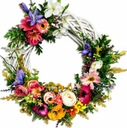 BIELONY WIKLINOWY WIANEK PRZOZDOBIONY RÓŻNORODNYMI SZTUCZNYMI KWIATAMI ORAZ DODATKAMI ZIELONYMI