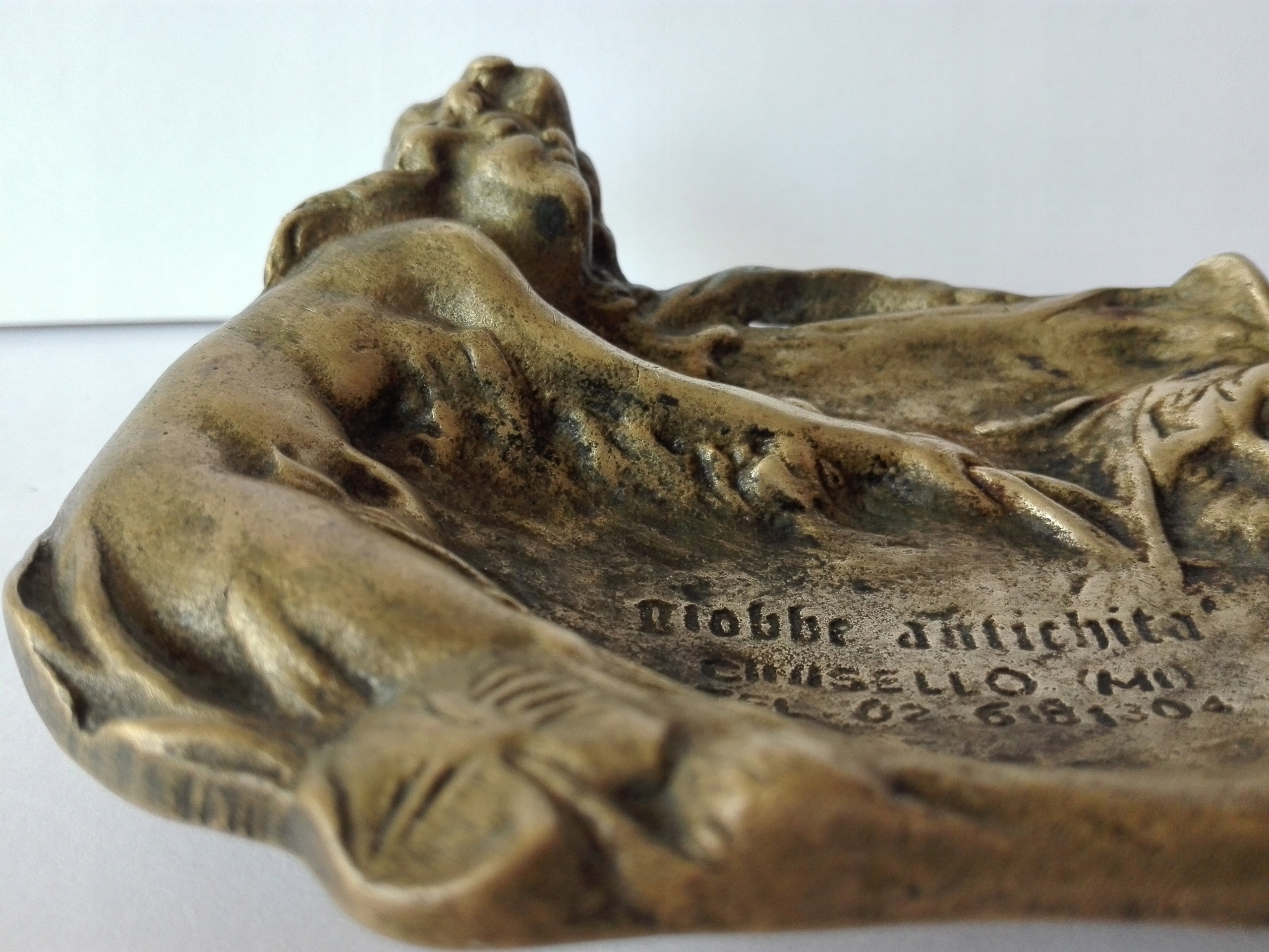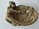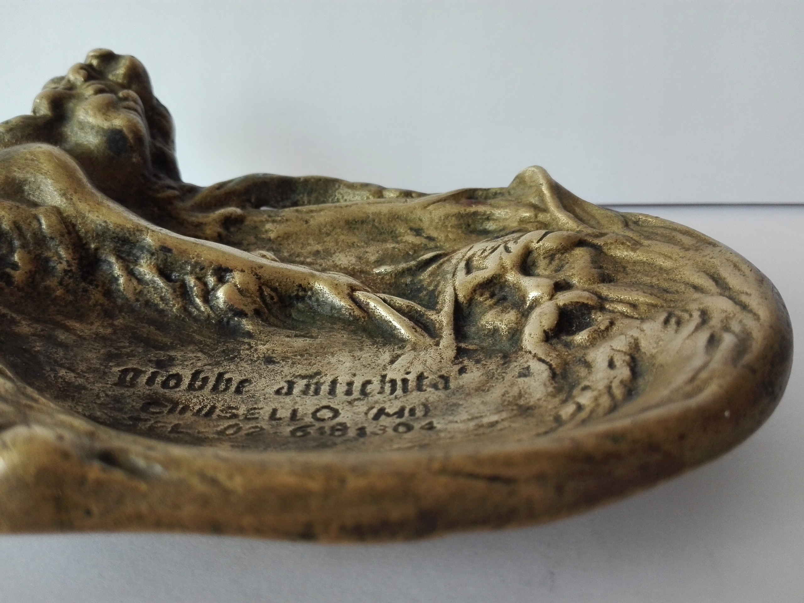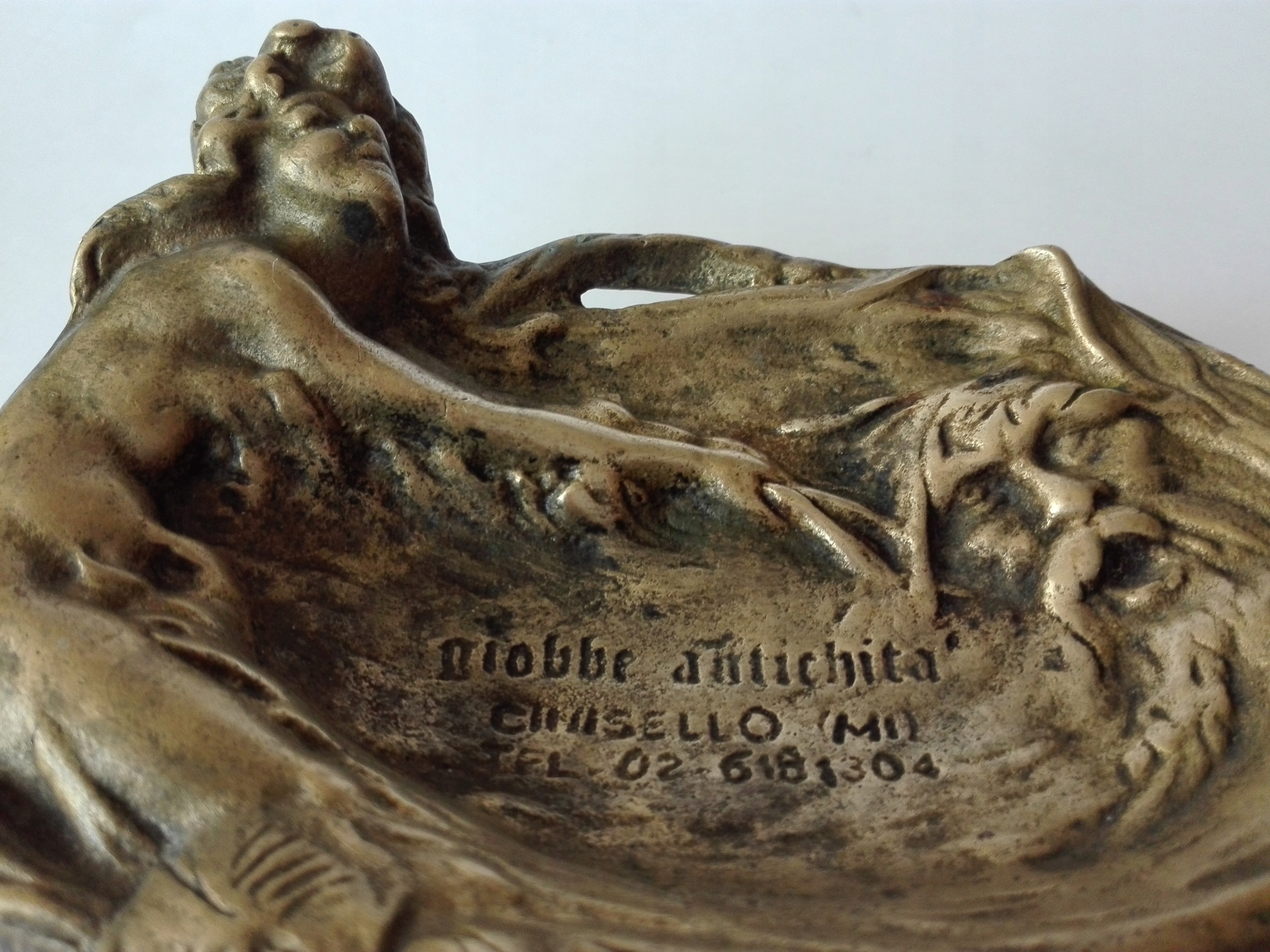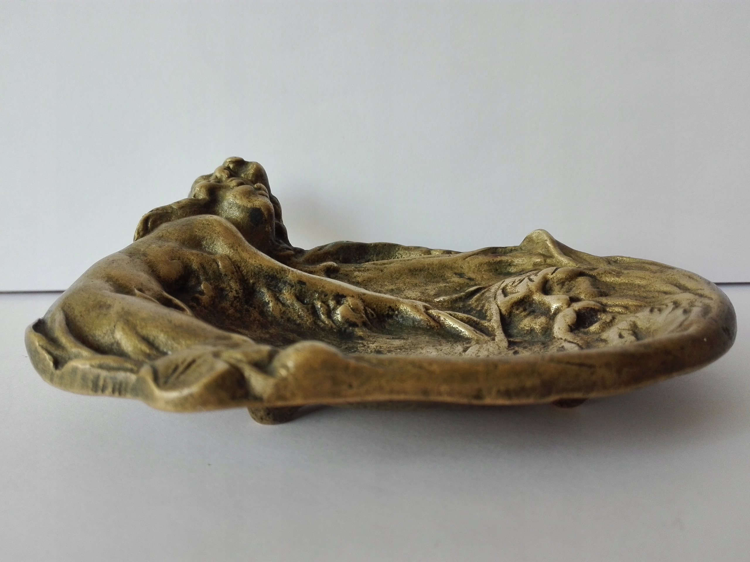 stary,secesyjny , kolekcjonerski, mosiężny wizytownik z postaciami nimfy i boga wiatru. Przedmiot nie jest nowy.