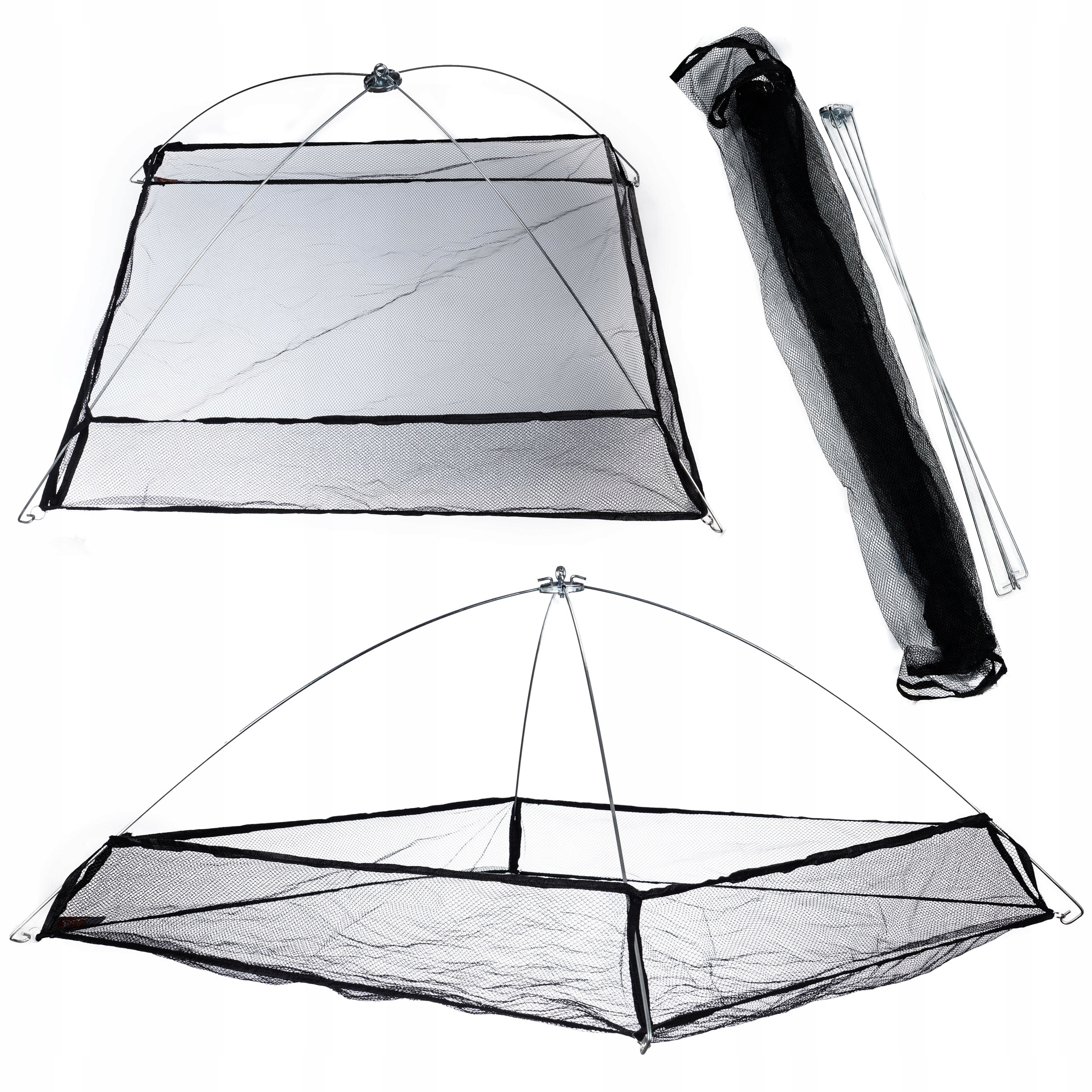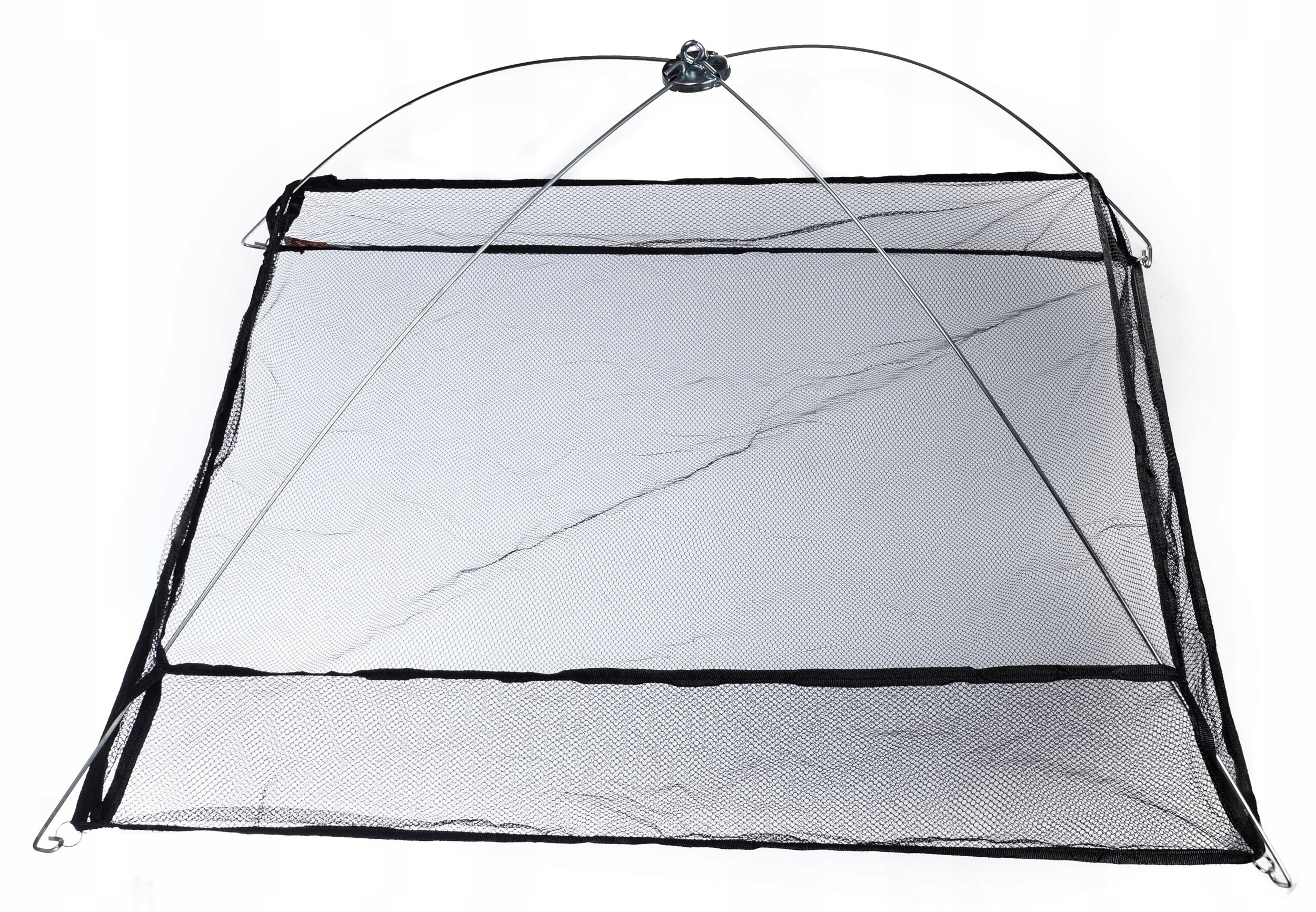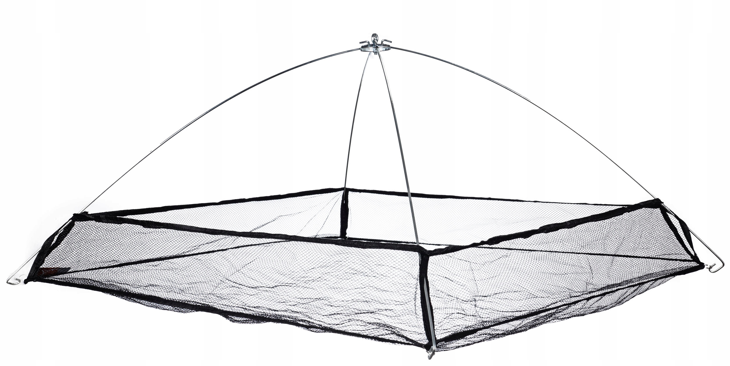 Kwardatowa podrywka o wymiarach 80X80 cm rozpięta na składanym metalowym pałąku. Podrywka posiada kołnierz o wysokości 15 cm, który zapobiega wypadnięciu ryb z siatki oraz końcówkę do zamontowania sznurka znajdującą się na wierzchołku stelarza.