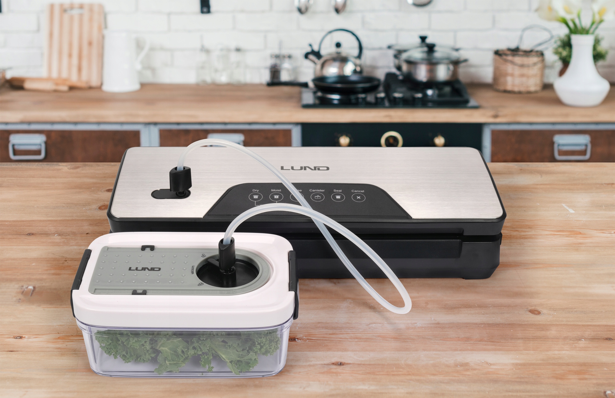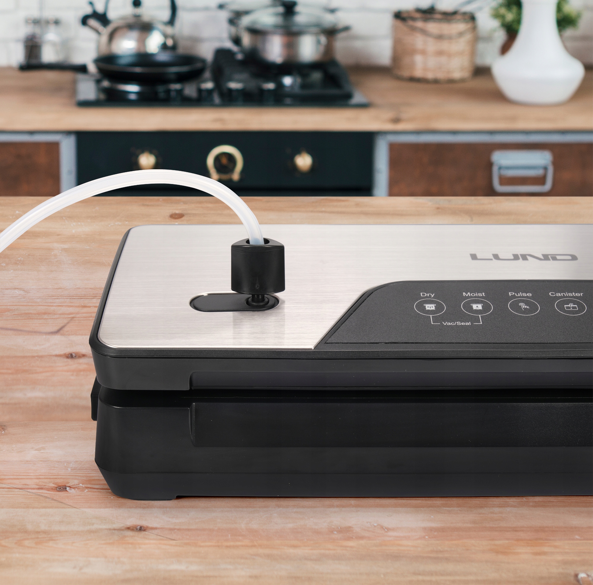 Uniwersalna i niezawodna pakowarka próżniowa LUND o mocy 130W i maksymalnej szerokości zgrzewania worka aż 30 cm.