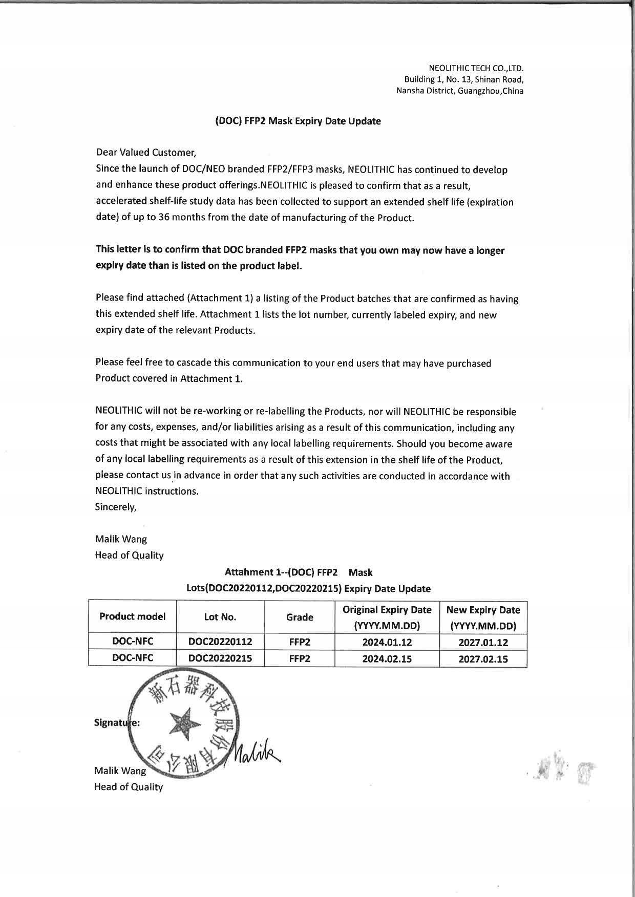 Na podstawie certyfikatu wydanego przez producenta data ważności maseczek została przedłużona o 36 miesięcy do 15.02.2027.