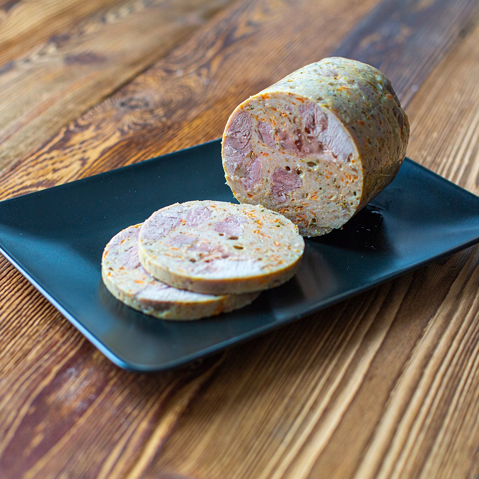 Oba składniki wkładamy do miski i dodajemy peklosól i przyprawy, całość ugniatamy minimum 15 minut. Przykrywamy miskę i wkładamy całość do lodówki na 24 godziny. Po 12 godzinach ugniatamy około 10 minut. Po 24 godzinach dodajemy do mięsa wodę, płaską łyżeczkę żelatyny, wciskamy ząbek czosnku i ponownie masujemy. Wkładamy całość do szynkowara i bardzo dokładnie ubijamy. Zamykamy pojemnik. Dusimy w kąpieli wodnej o temperaturze 80-90*C przez 2,5 godziny. Po schłodzeniu wyjmujemy potrawę z szynkowara.