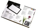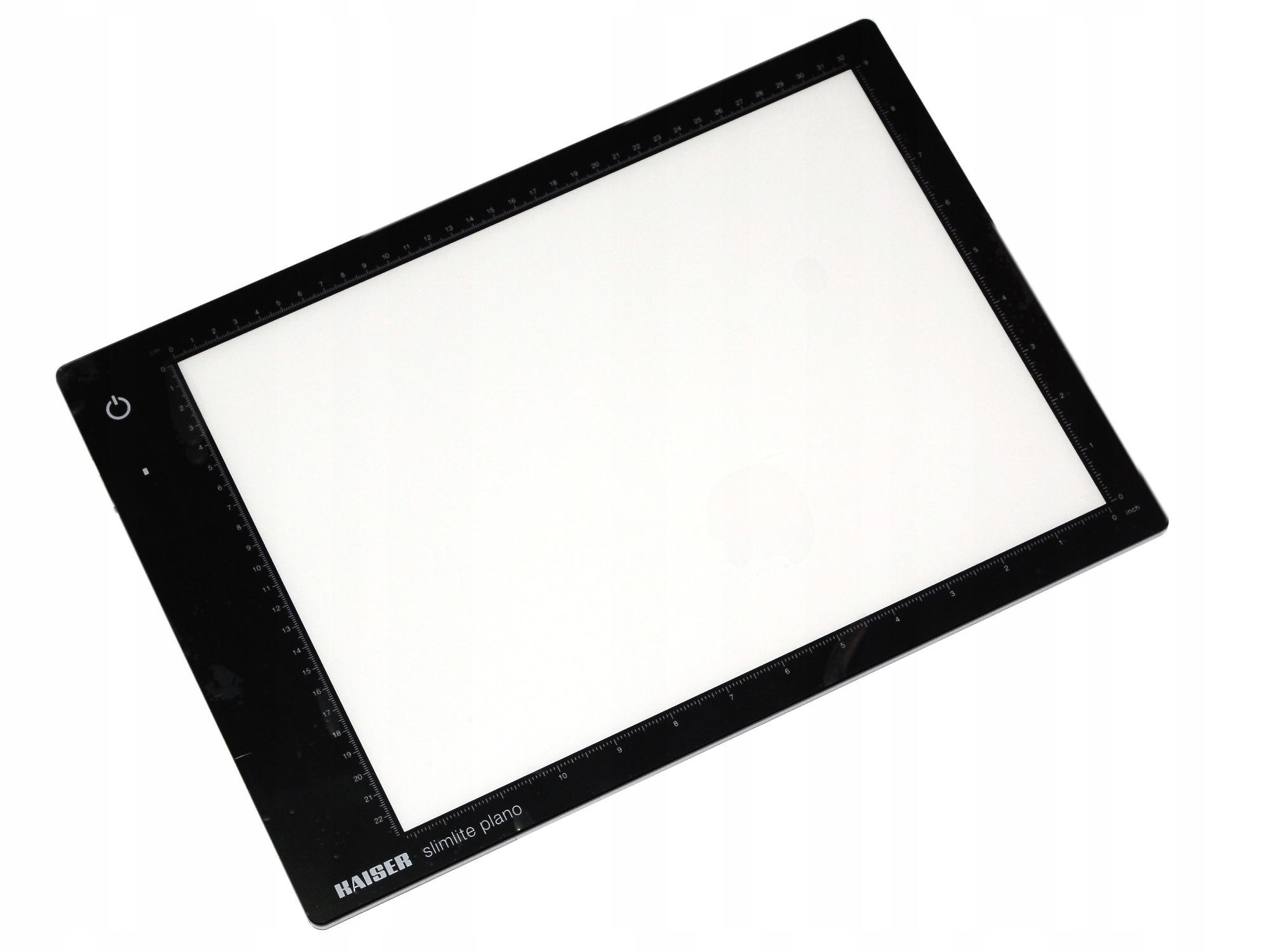 Opis artykułu: Nowa podświetlarka firmy Kaiser na diodach LED - wymiary ekranu świecącego: 22,8x32 cm, wymiar zewnętrzny jest większy o niecałe 5 cm. po dłuższym boku i półtora centymetra po krótszym boku. Bardzo cienka, ma tylko 8 mm. grubości. Czarna obudowa z naniesioną miarką w centymetrach i calach. Podświetlarka zasilana jest z akumulatora wbudowanego wewnątrz, ładowanie odbywa się przez złącze USB z boku obudowy. Na obudowie znajduje się także wyłącznik główny. Używać ją można zarówno podłączoną do "prądu" jak i z wewnętrznego akumulatora Li-Ion o pojemności 1050 mAh. Załączono przewód USB oraz wtyczkę do gniazdka na 230V przetwarzającą napięcie na odpowiednie do zasilania urządzenia - 5 V. Slimlite Plano daje równomierne krycie światłem całego obszaru i pozwala regulować jasność ekranu. Światło ma temperaturę 5000 K - kolorowe materiały utarło się oglądać przy temperaturze 5500 K ale sądzę, że w wielu zastosowaniach amatorskich dużego problemu nie będzie.