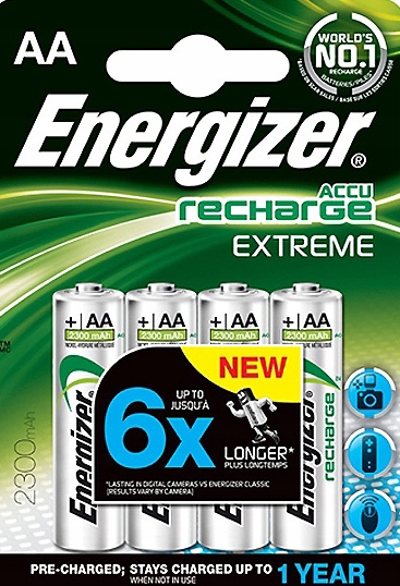 Energizer®oferuje akumulator AA zapewniający potrzebną Ci długotrwałą wydajność i żywotność – w połączeniu z wygodą długotrwałego utrzymania ładunku. Nieużywany akumulator utrzymuje ładunek aż do roku. Energizer® Extreme to wysokowydajne rozwiązanie wielokrotnego ładowania na wszystkie okazje i do wszystkich urządzeń o dużym zapotrzebowaniu na energię, co pozwala zaoszczędzić pieniądze** i ograniczyć ilość odpadów*** dzięki zużyciu mniejszej liczby baterii.