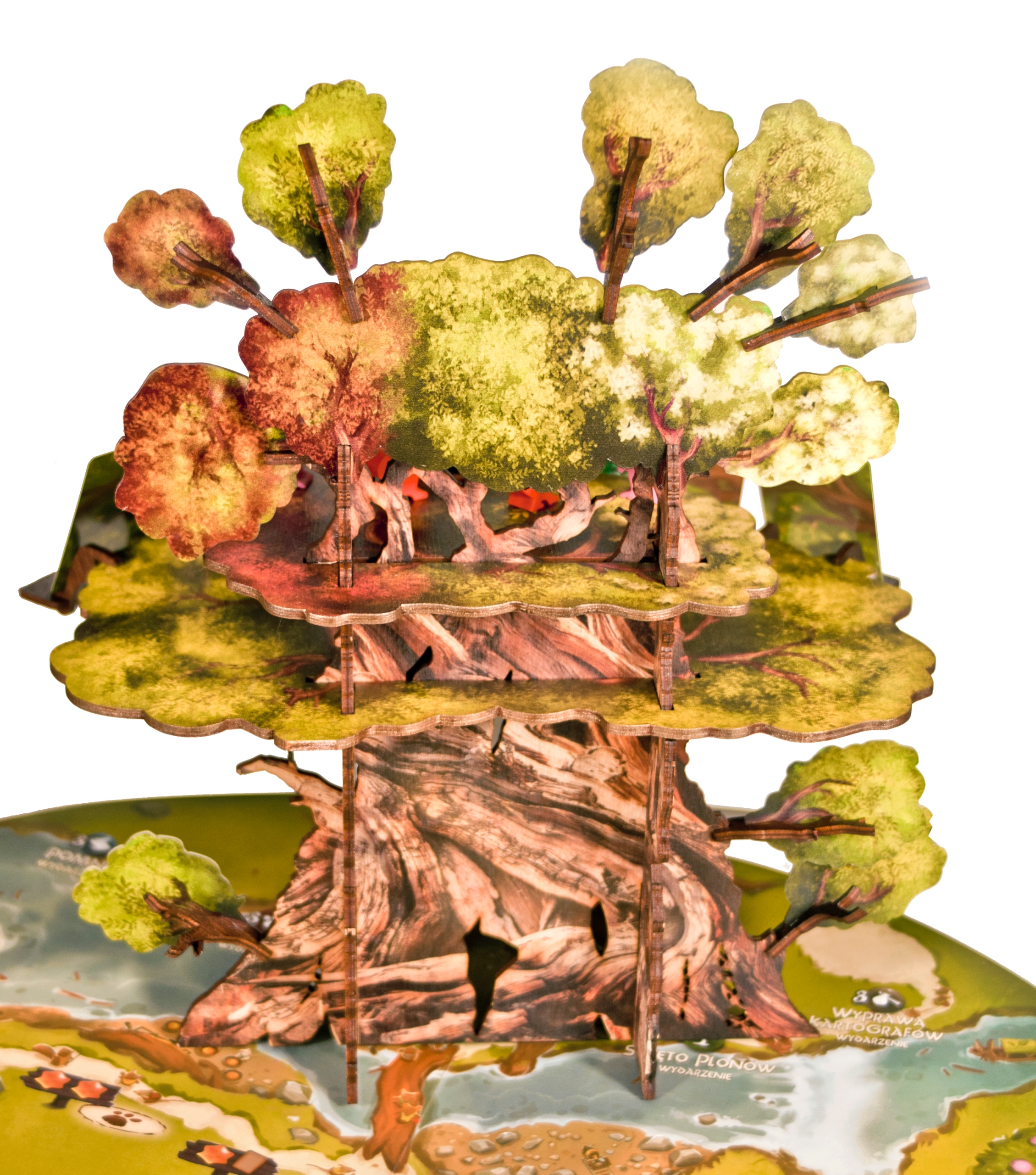 -Dwa poziome elementy korony drzewa na meeple graczy oraz karty wydarzeń z obustronnym nadrukiem bezpośrednio na sklejce