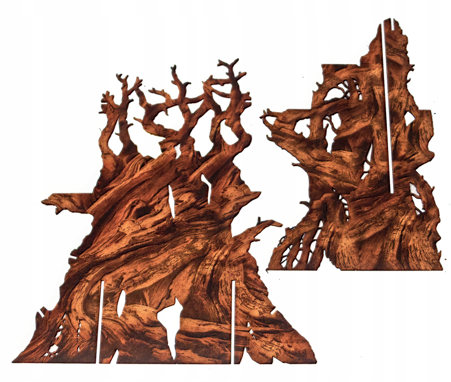 Elementy poziome drzewa oraz elementy domków dla targu posiadają z jednej strony zadruk zielony, a z drugiej nadrukowane słoje ciemnego drewna.