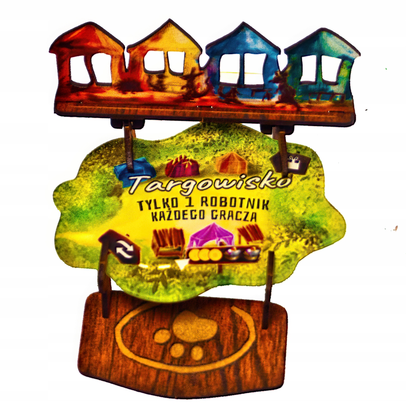 -Doczepiane na drzewku przestrzenne pole targu z dodatkową dużą huśtawką i bejcowanymi domkami (akryl z zadrukiem+sklejka)