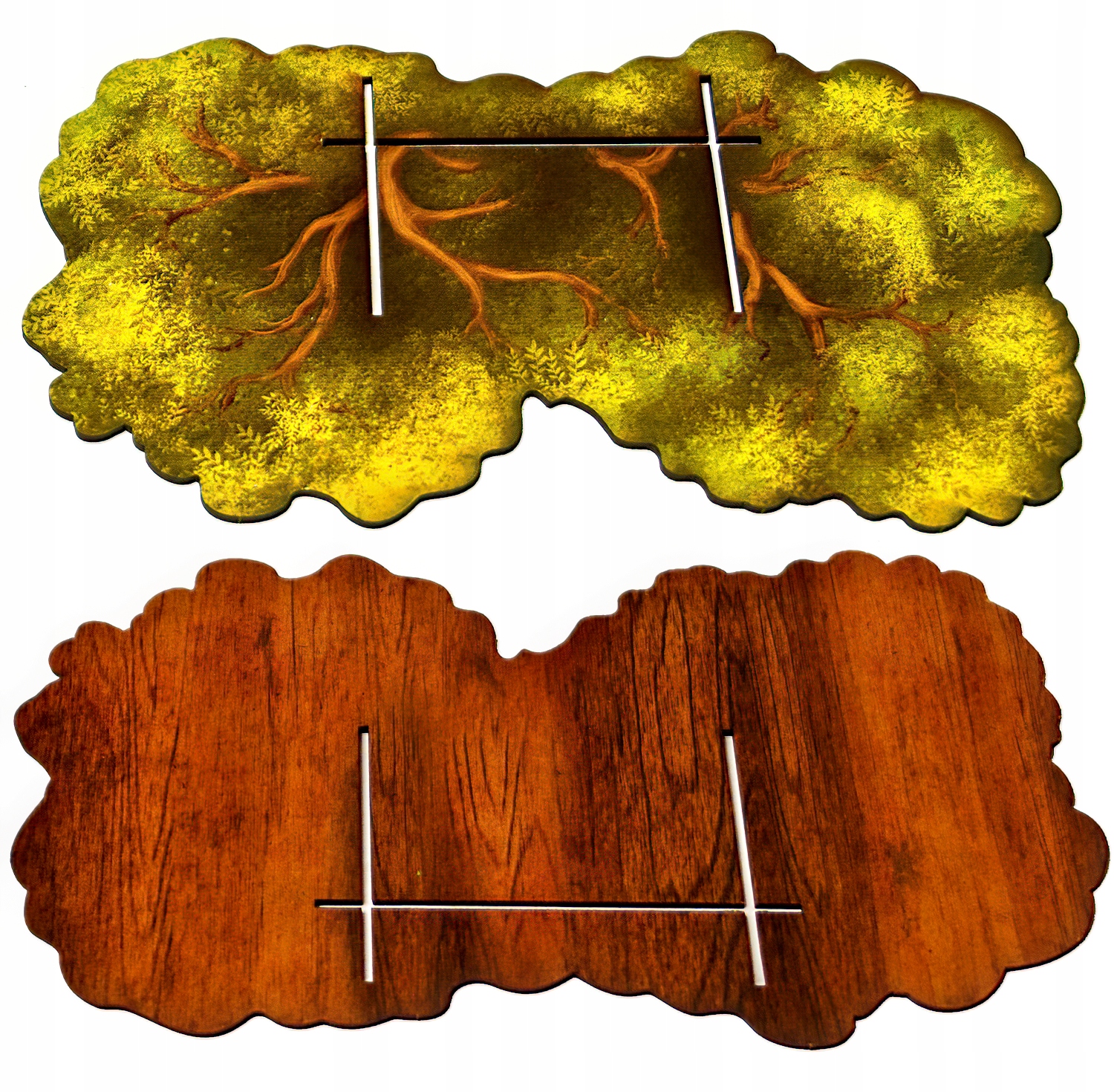 -Dwa poziome elementy korony drzewa na meeple graczy oraz karty wydarzeń z jednostronnym nadrukiem bezpośrednio na sklejce (druga strona bejcowana)