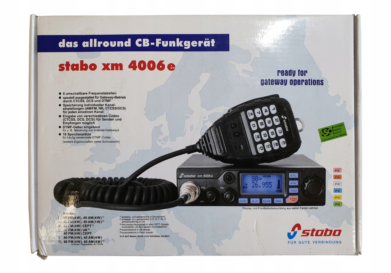 CB radio STABO XM-4006E to świetna propozycja na rynku radiotelefonów CB - kompaktowe CB RADIO, które swoimi parametrami pracy dorównuje urządzeniom z wyższej półki. W niewielkiej obudowie o wymiarach : 139 x 37 x 184 mm zawarto wszystkie niezbędne funkcje zapewniające najwyższą jakość nadawania i odbioru w każdych warunkach. Dzięki tak niewielkim wymiarom radio komfortowo zamocujesz w każdym samochodzie: osobowym, dostawczym czy ciężarowym. To także doskonałe rozwiązanie dla każdego, kto chce aby CB-Radio pozostało niewidoczne w samochodzie.