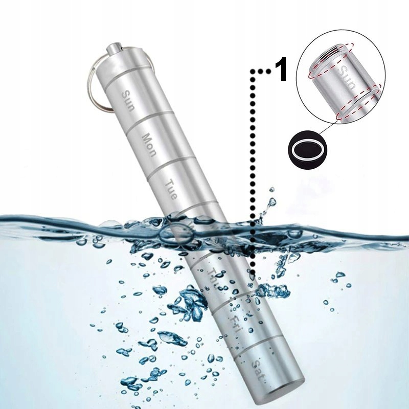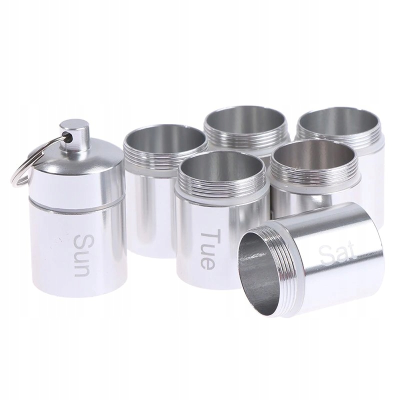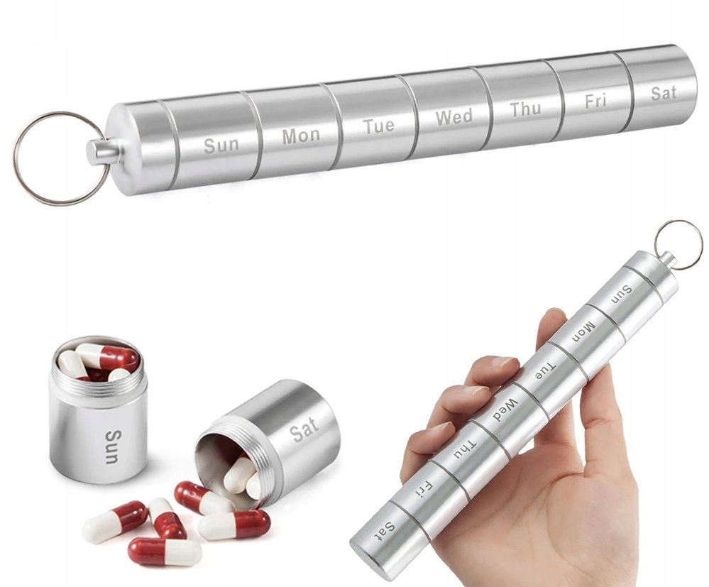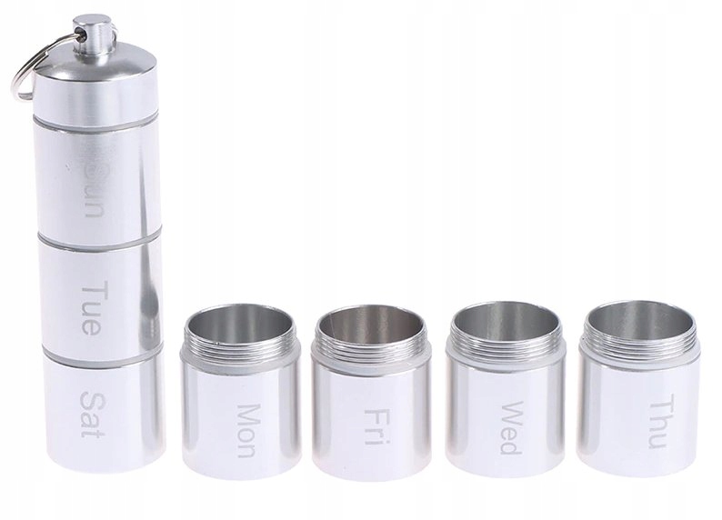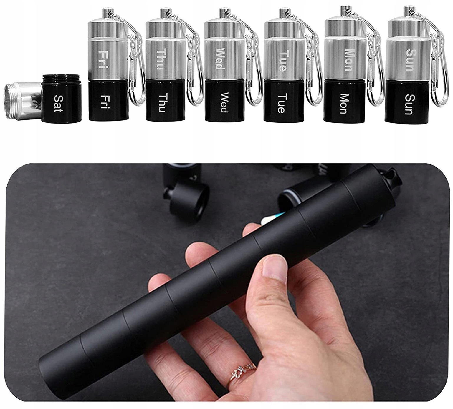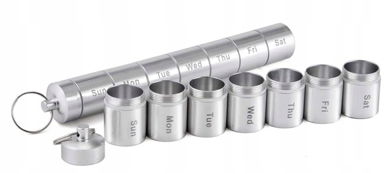 Jest przeznaczony do wygodnego przechowywania i sortowania tabletek na cały tydzień. Wykonany z aluminium. Każdy pojemnik wyposażony w silikonową uszczelkę - zapewniającą ochronę przed pyłem i wilgocią. Zamontowane kółko pozwoli na zamocowanie pojemnika np. na plecaku. Nie trzeba nosić wszystkich 7 pojemników, można odkręcić jeden z nich i przyczepić do głównego uchwytu.