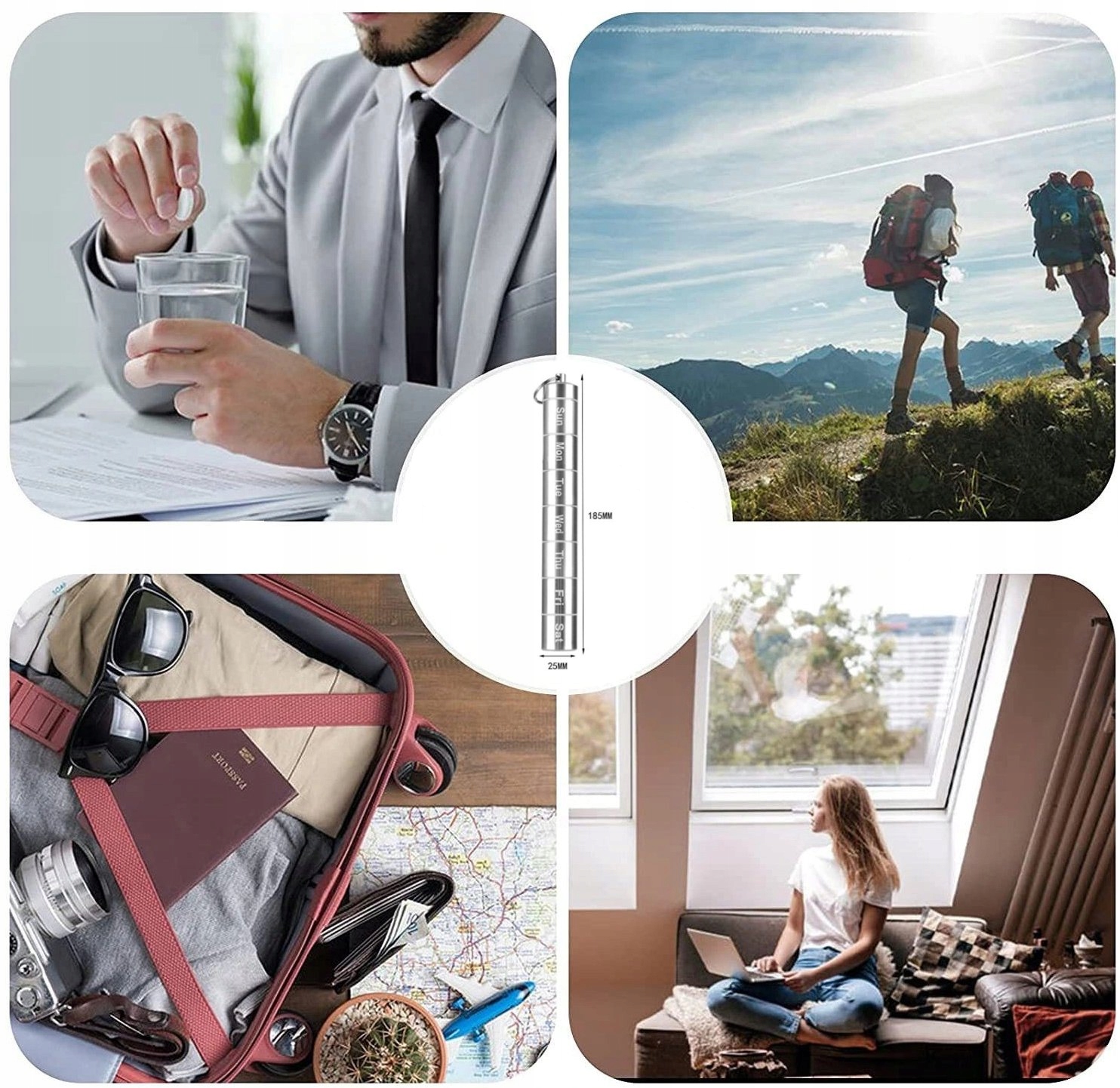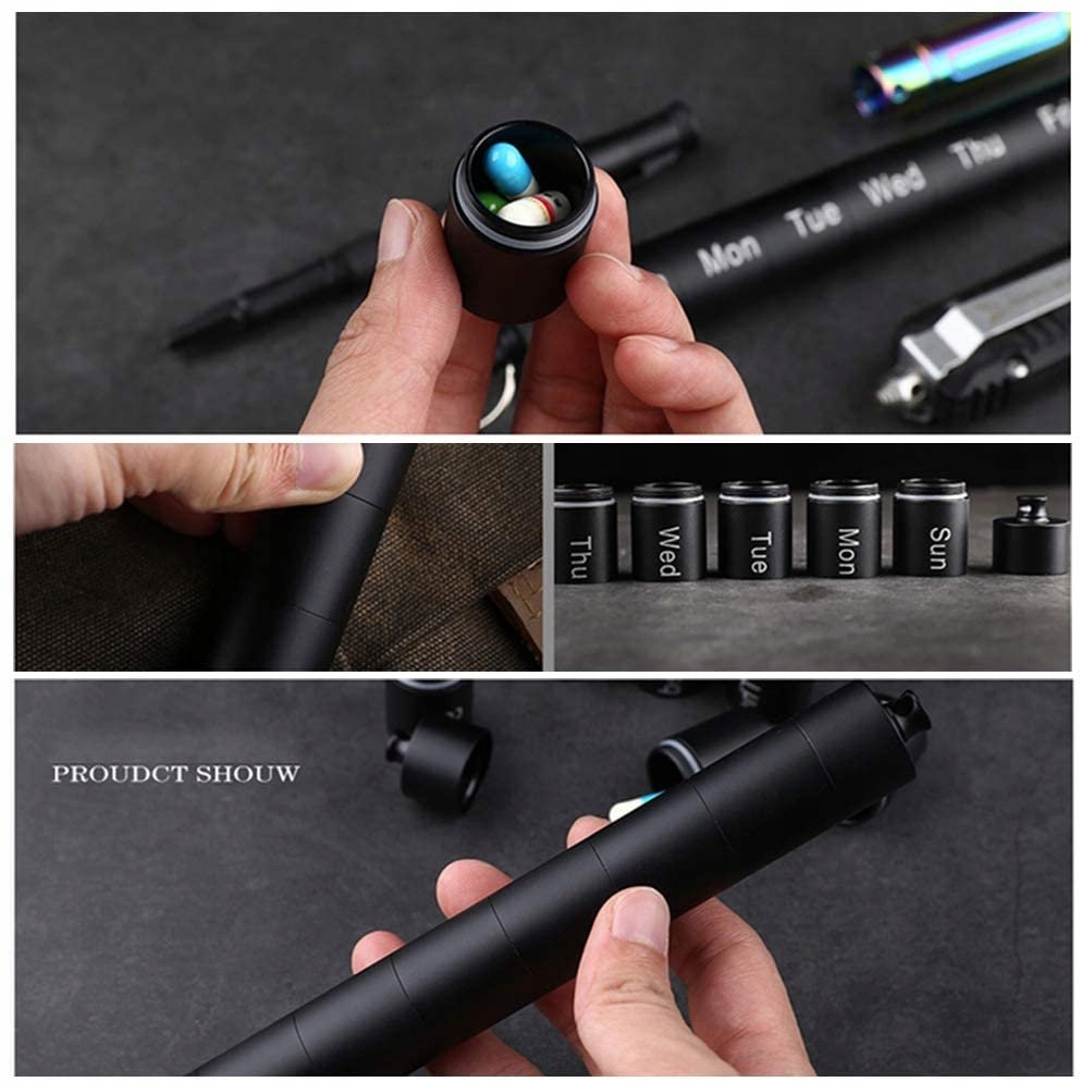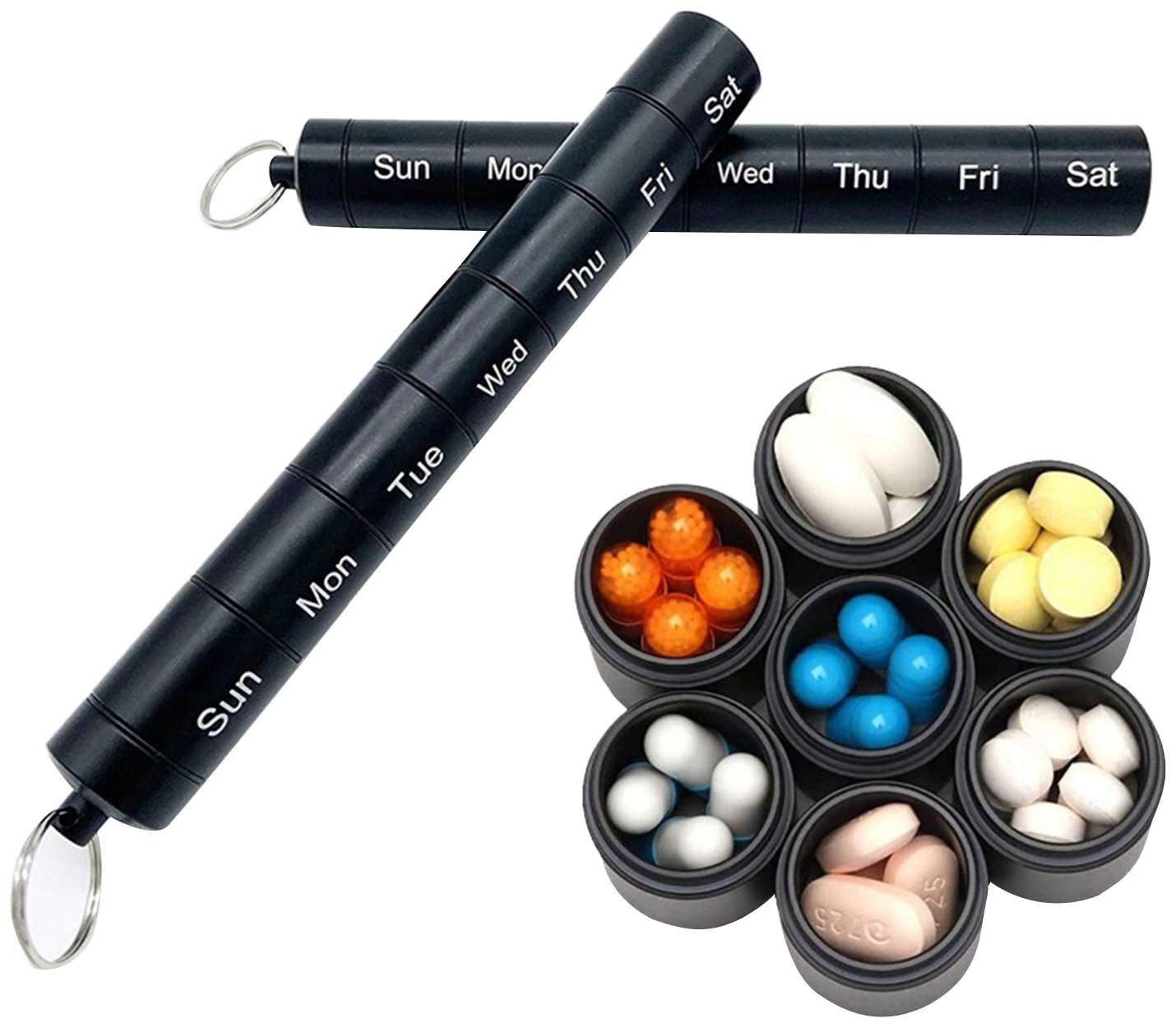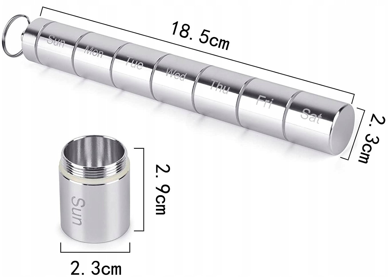 Jest przeznaczony do wygodnego przechowywania i sortowania tabletek na cały tydzień. Wykonany z aluminium. Każdy pojemnik wyposażony w silikonową uszczelkę - zapewniającą ochronę przed pyłem i wilgocią. Zamontowane kółko pozwoli na zamocowanie pojemnika np. na plecaku. Nie trzeba nosić wszystkich 7 pojemników, można odkręcić jeden z nich i przyczepić do głównego uchwytu.