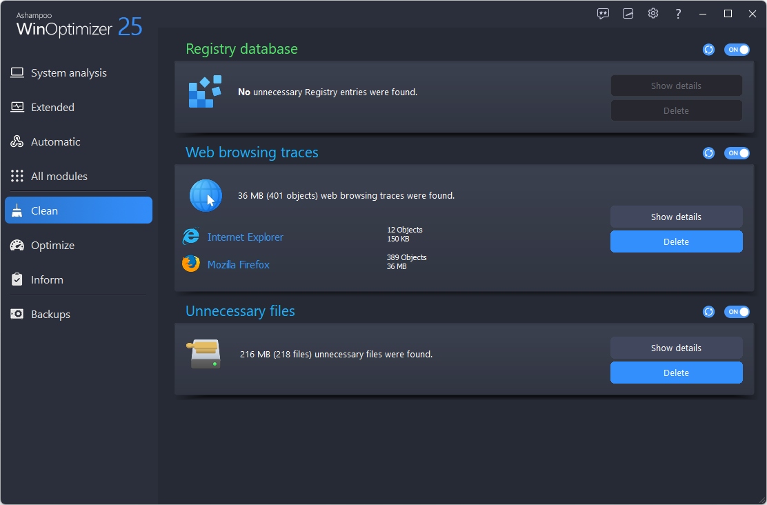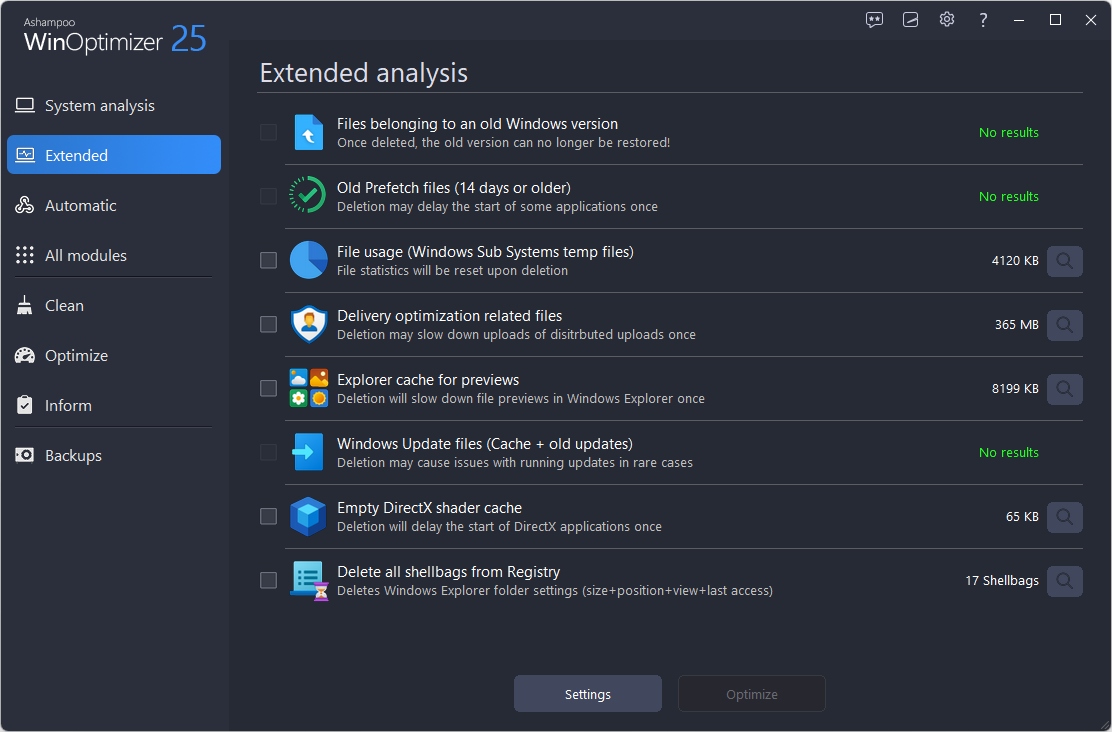 Moduły czyszczące w Ashampoo WinOptimizer 25 są 50% szybsze i bardziej efektywne niż w poprzedniej generacji, dzięki usprawnionej technologii działania. Nigdy wcześniej nie osiągnięto takiego usprawnienia między kolejnymi wersjami WinOptimizer! Ponadto Czyszczenie Dysku oraz Czyszczenie Internetowe są niemal na wyżynach swoich osiągnięć wydajności i skuteczności. Starsze systemy również zyskają na wydajności, także dzięki poprawionym animacjom, zredukowanemu zużyciu pamięci oraz menu kontekstowym. Naturalnie, wszystkie moduły zostały uaktualnione dla pełnej zgodności z systemami, instalatorami oraz przeglądarkami.